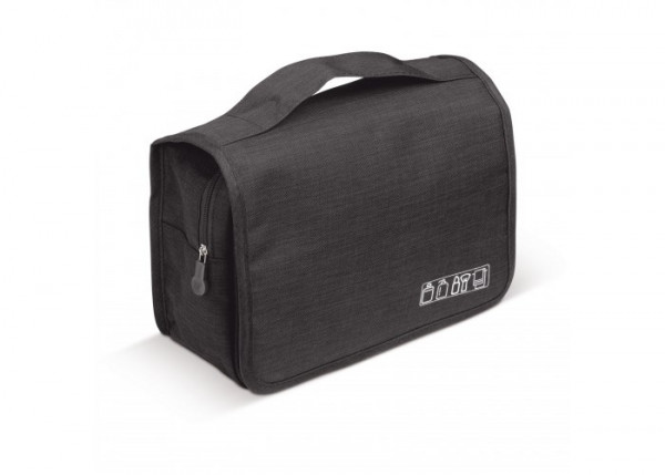 Praktische toilettas voorzien van vakjes en een haak om handig op te hangen.