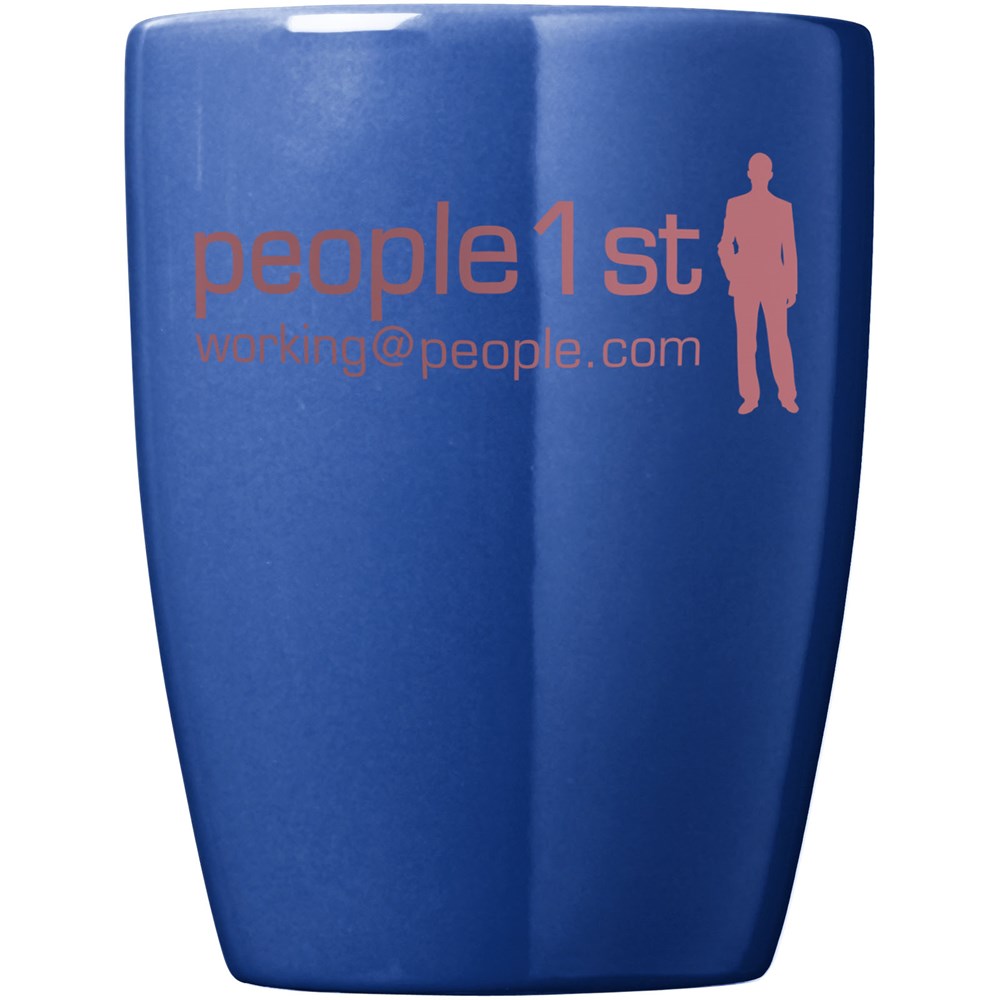 Trendy design mok van keramiek. Vaatwasmachinebestendig volgens EN12875-1 (minimaal 125 wasbeurten) voor alle decoratiemethoden. Inhoud 350 ml. Geleverd in een witte geschenkverpakking.