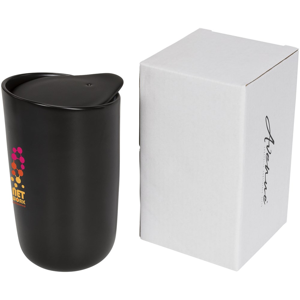 Dubbelwandige keramische beker met keramische deksel. Past onder de meeste koffiezetapparaten en kan in de magnetron. Verwijder de siliconen tussenlaag van de keramische deksel voordat je de beker in de magnetron doet. Vaatwasmachinebestendig volgens EN12875-1 (minimaal 125 wasbeurten) voor alle decoratiemethoden. Inhoud 400ml. Geleverd in een Avenue geschenkverpakking.