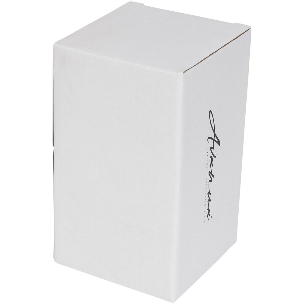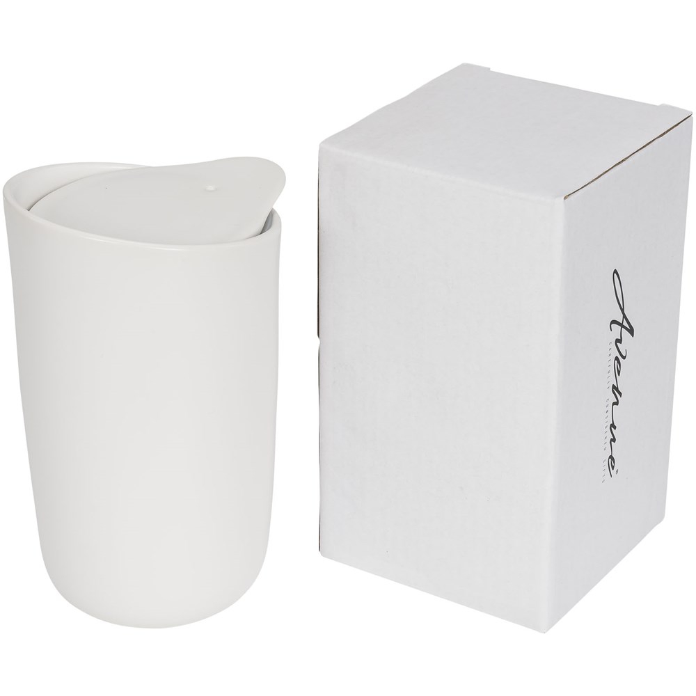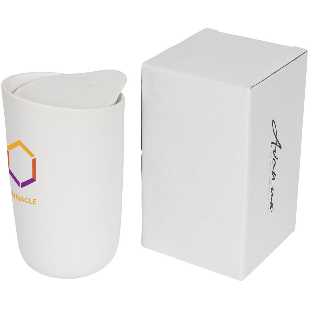Dubbelwandige keramische beker met keramische deksel. Past onder de meeste koffiezetapparaten en kan in de magnetron. Verwijder de siliconen tussenlaag van de keramische deksel voordat je de beker in de magnetron doet. Vaatwasmachinebestendig volgens EN12875-1 (minimaal 125 wasbeurten) voor alle decoratiemethoden. Inhoud 400ml. Geleverd in een Avenue geschenkverpakking.