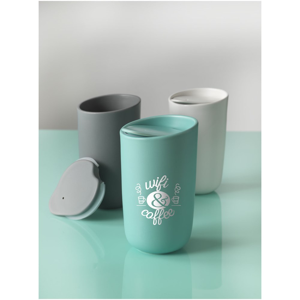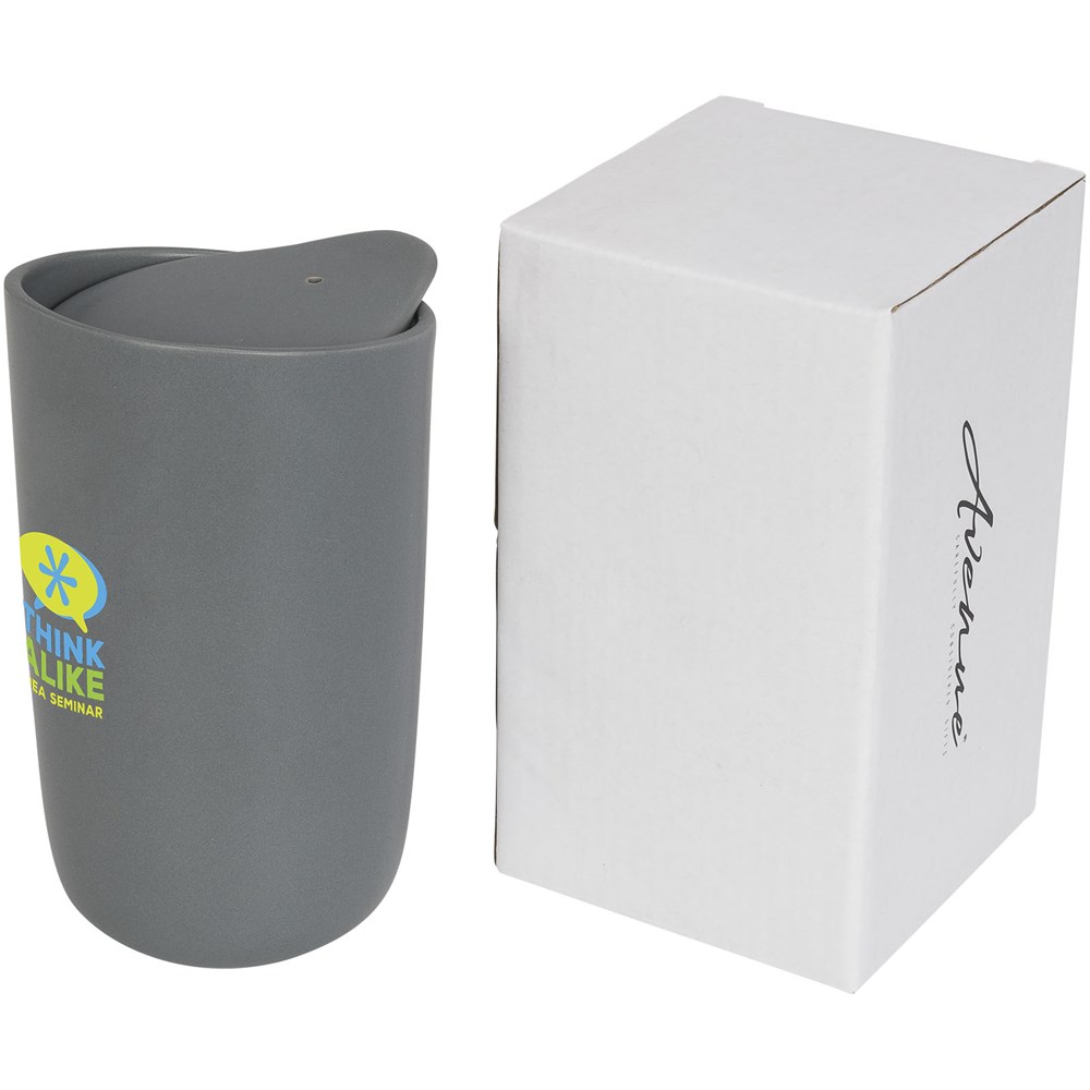 Dubbelwandige keramische beker met keramische deksel. Past onder de meeste koffiezetapparaten en kan in de magnetron. Verwijder de siliconen tussenlaag van de keramische deksel voordat je de beker in de magnetron doet. Vaatwasmachinebestendig volgens EN12875-1 (minimaal 125 wasbeurten) voor alle decoratiemethoden. Inhoud 400ml. Geleverd in een Avenue geschenkverpakking.