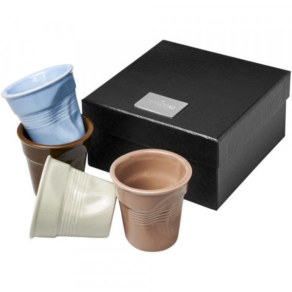 Espressoset met 80 ml kopjes in een geschenkverpakking. Met decoratieplaat. Kopjes zijn vaatwasserbestendig. Exclusief ontwerp.