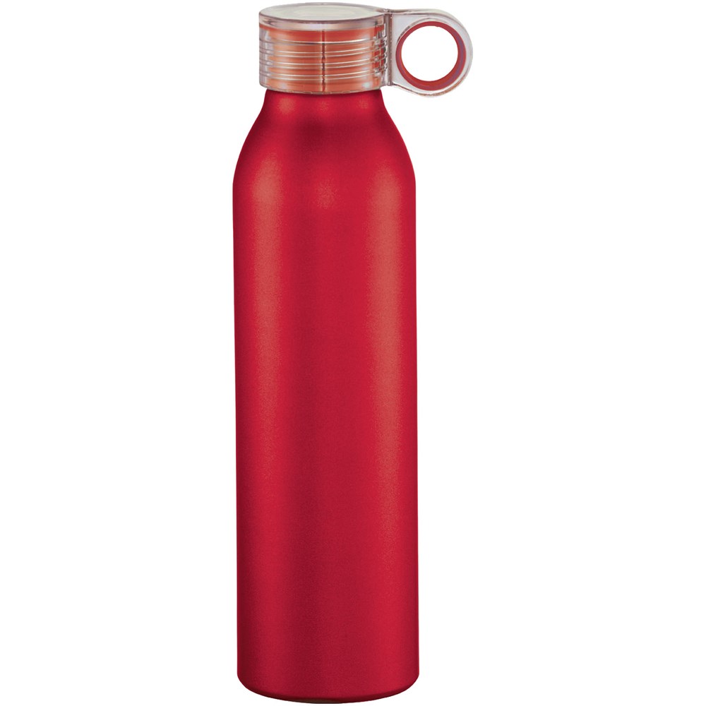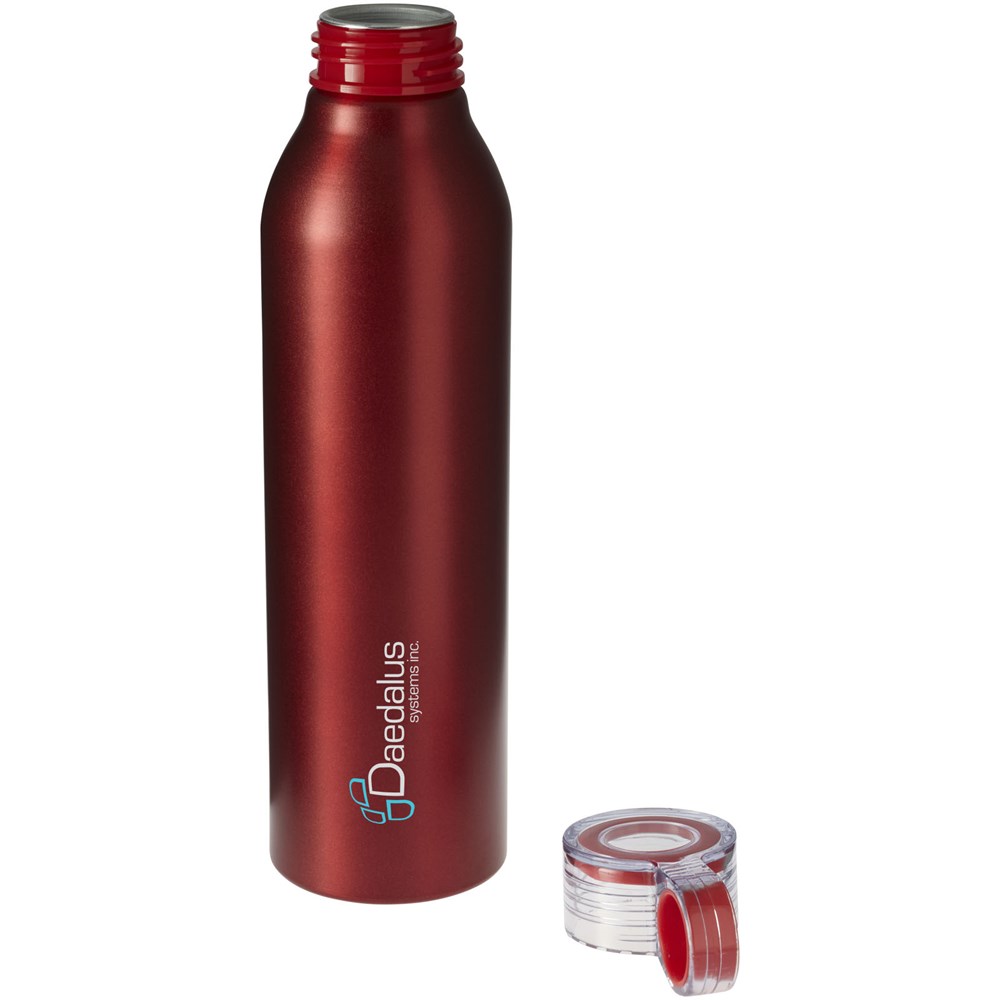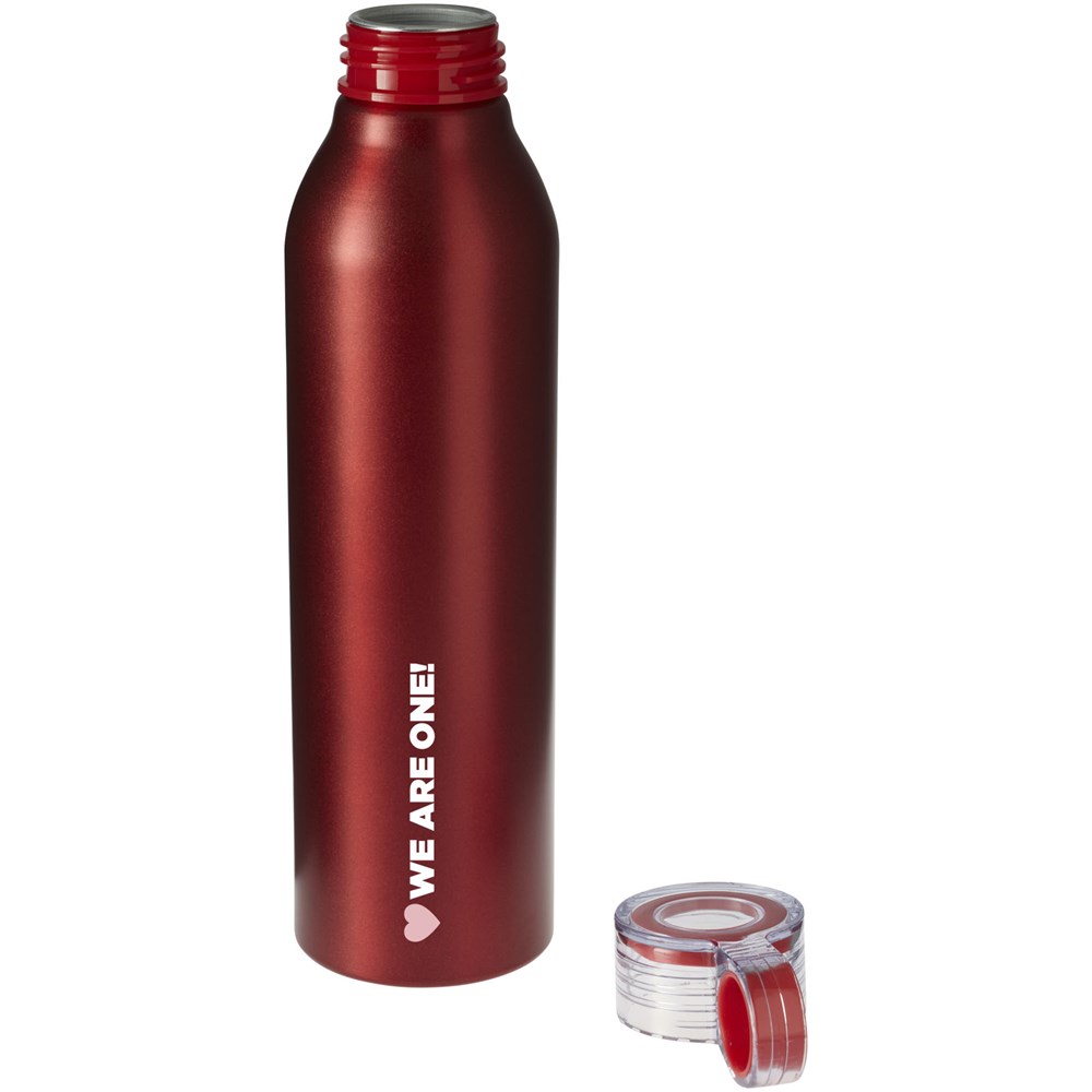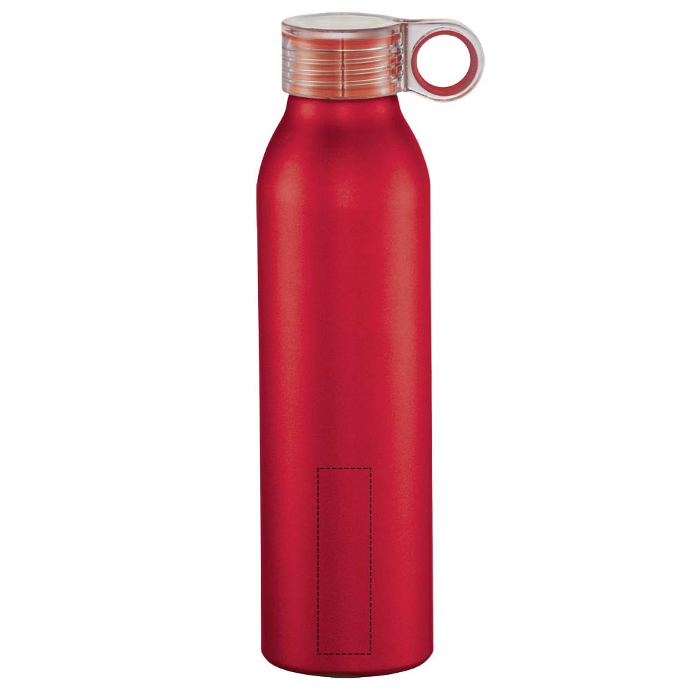 Enkelwandige sportfles met een schroefdop en lekvrij. Eenvoudig aan de pols te dragen. Matte metalen kleurafwerking. Inhoud 650 ml.