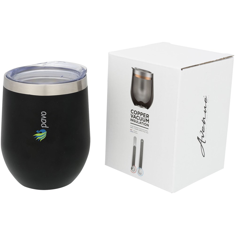 De Corzo koper vacuüm geïsoleerde beker heeft een dubbelwandige vacuümconstructie met koper isolatie, waarin uw drankje 6 uur warm en 24 uur koud blijft. De constructie voorkomt condensatie aan de buitenkant van de beker. Eenvoudige klikdop voor gemakkelijk drinken. Met spraypoedercoating op de buitenkant. Brede opening voor comfortabel vullen en schenken. Capaciteit is 350 ml. Gepresenteerd in een Avenue geschenkverpakking.