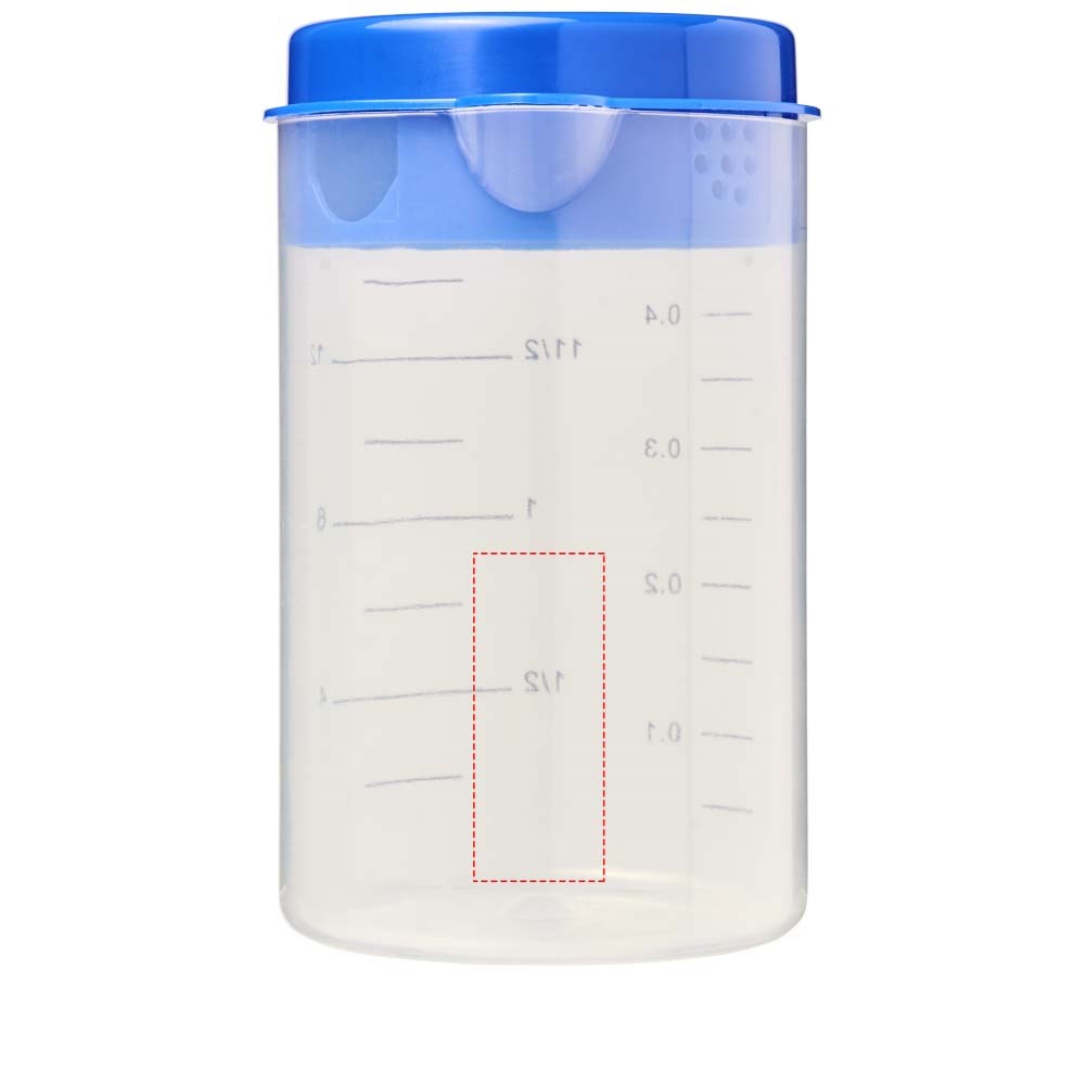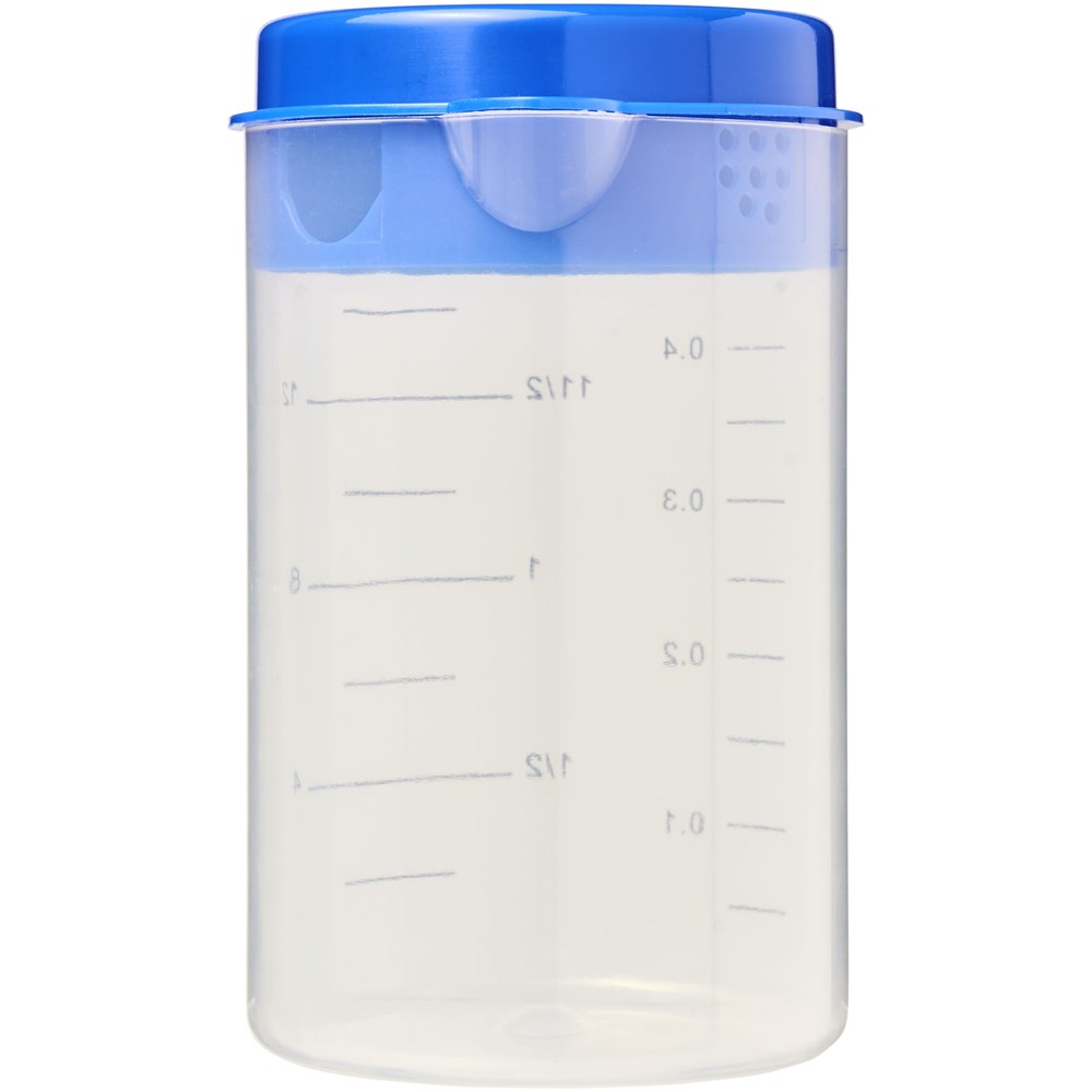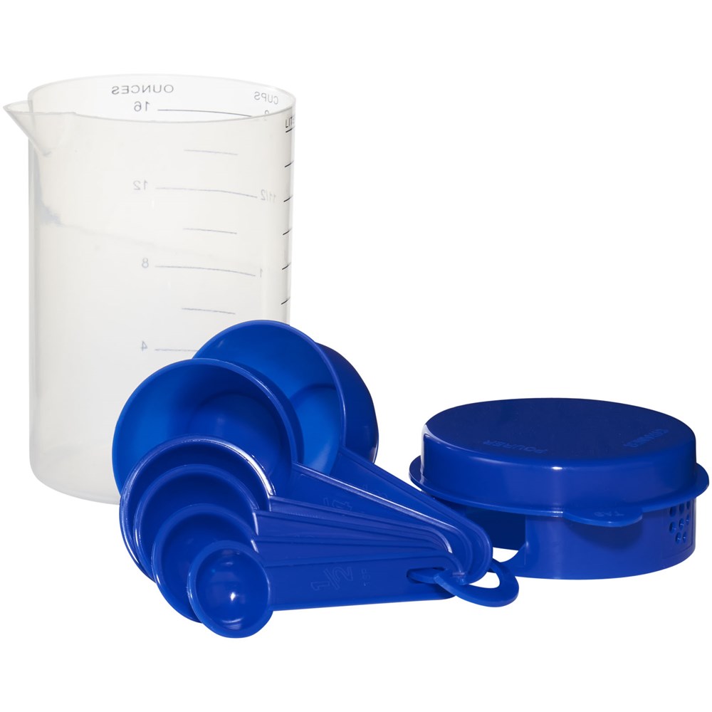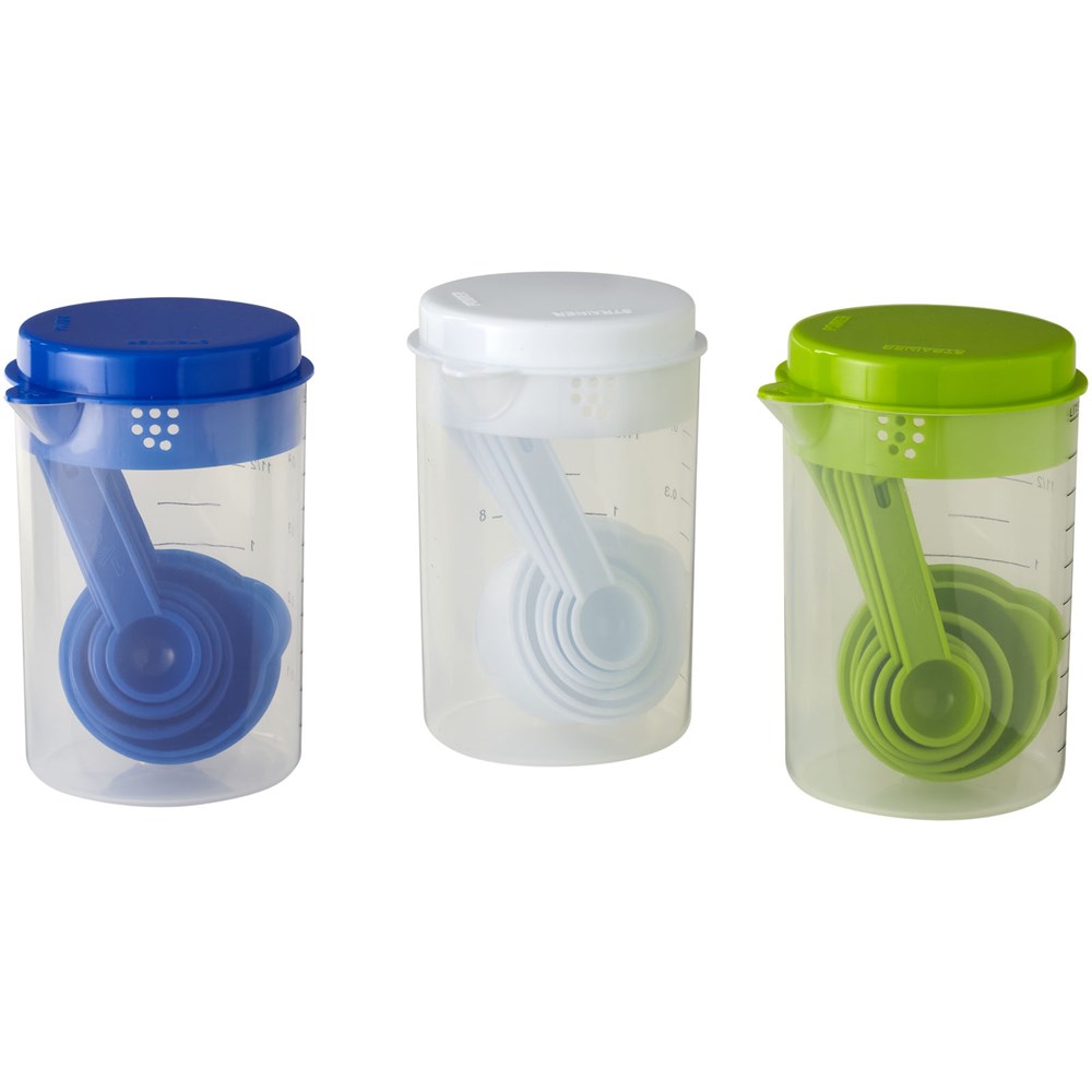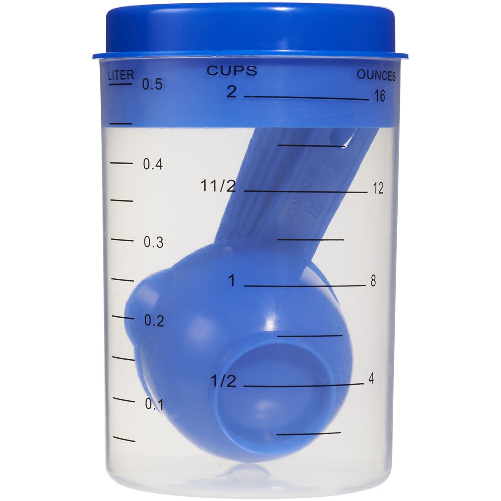 Maatbeker set bestaat uit een 0,5-liter beker met een deksel en diverse maat lepels die in de beker passen.
