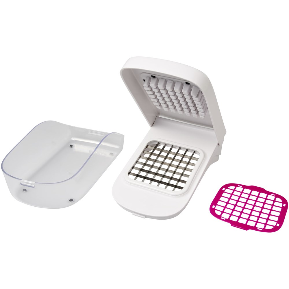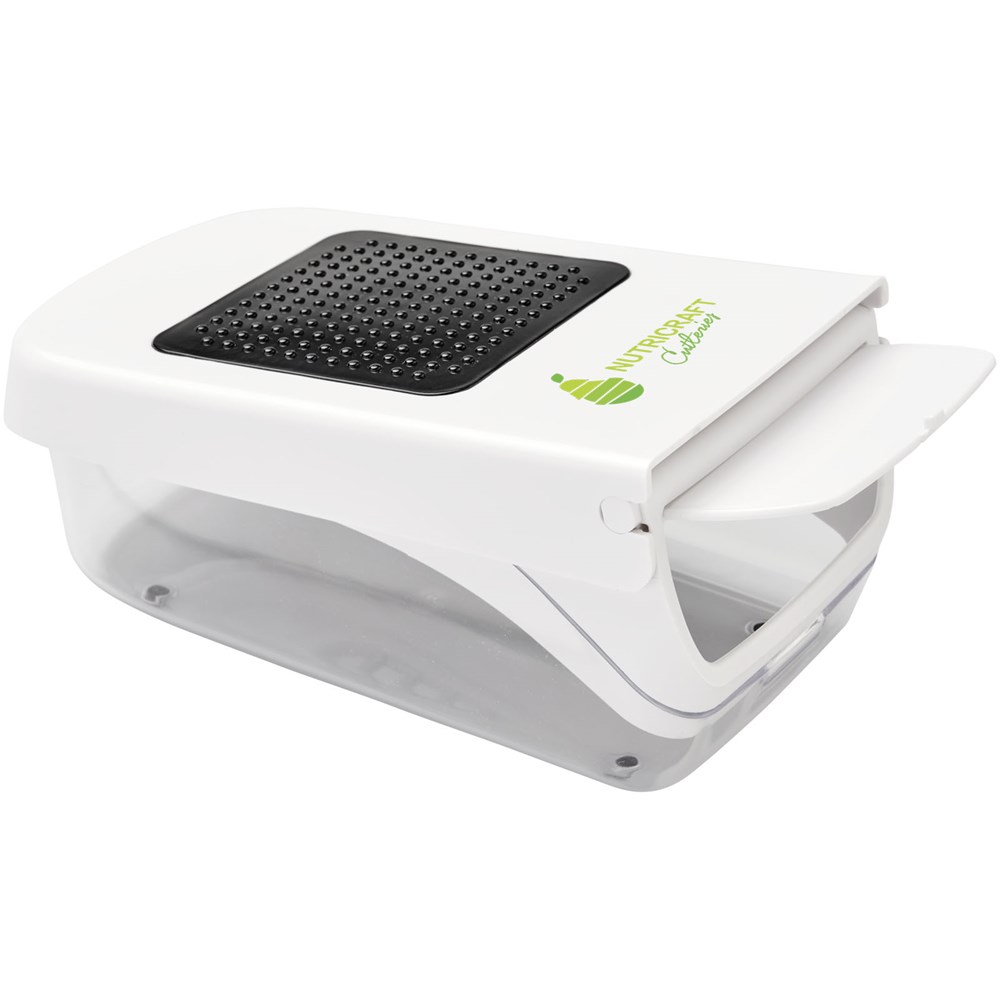 Multifunctioneel voedselbereidingssysteem. Wordt geleverd met een container, zodat alles wat wordt gehakt, er goed onder wordt geplaatst, zonder rommel te hoeven opruimen. De klep maakt het overbrengen van voedsel nog gemakkelijker.