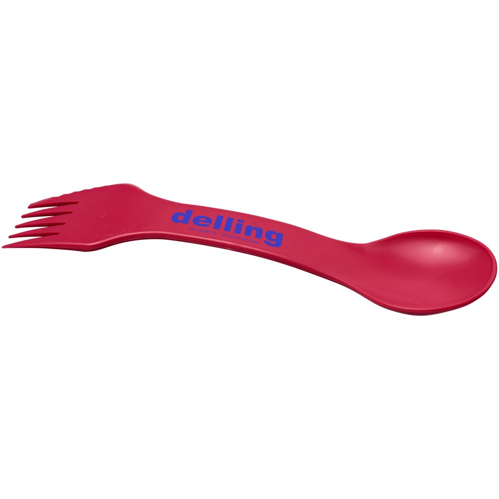 Een gecombineerde vork en lepel met snijvlak die geweldig is voor op de camping, festival of tijdens picknicks en andere buitenactiviteiten.