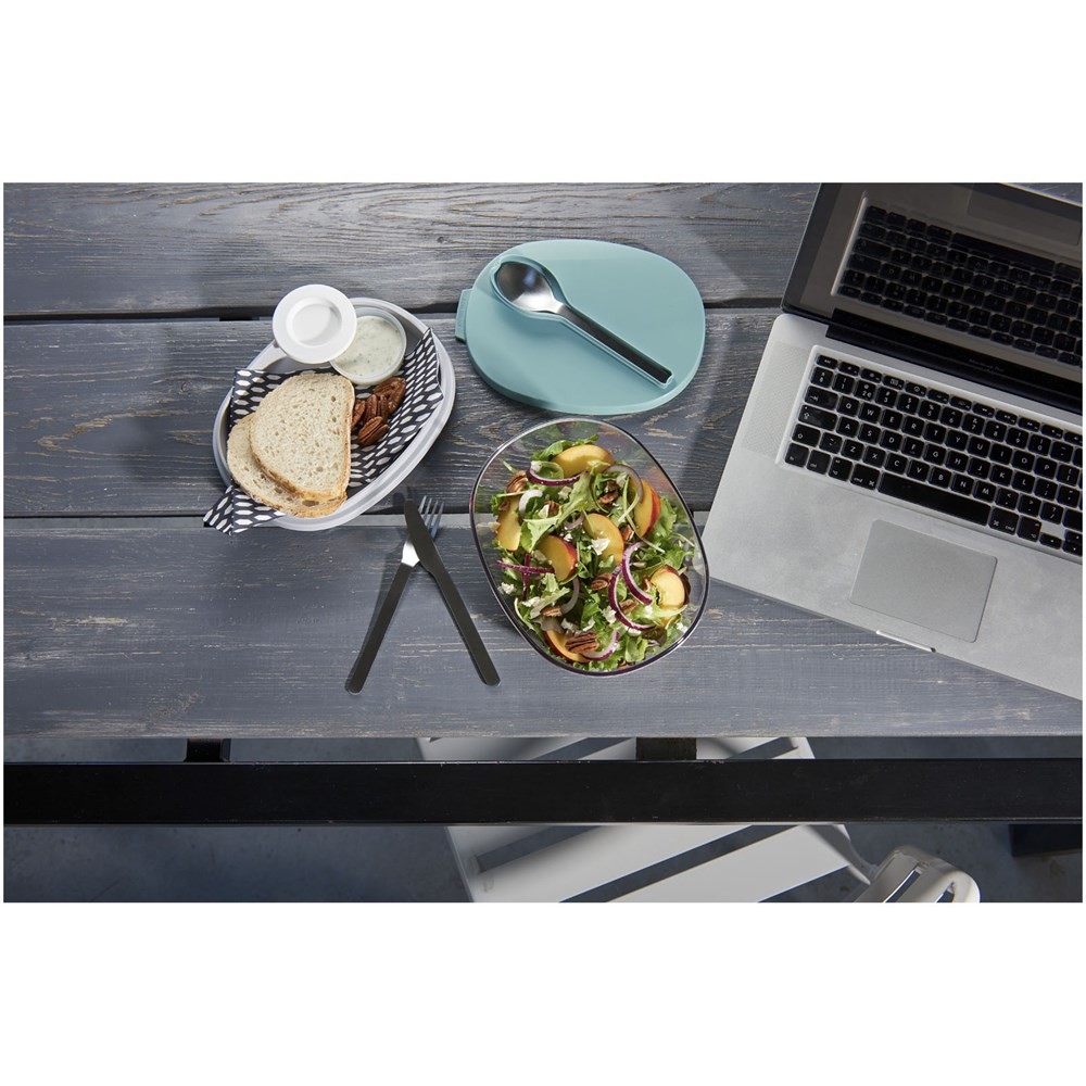 Saladebox met groot doorzichtig compartiment van 1300 ml dat groot genoeg is om de salade te mengen voor het eten. Het bovenste compartiment biedt ruimte voor brood of bestek. Inclusief een klein compartiment voor dressing of noten. Onbreekbaar en kan in de vaatwasser. Wordt geleverd met een elastische bandsluiting. BPA-vrij.