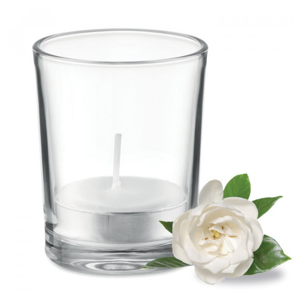 Gekleurd geurkaarsje in glazen houder.