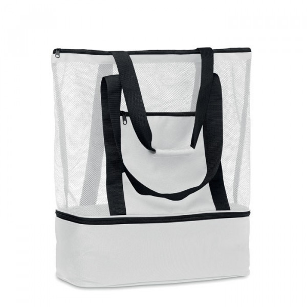 Boodschappentas/ strandtas van 600D RPET met lange draaghengsels en RPET mesh voorvakje met rits. Koelcompartiment in de bodem.