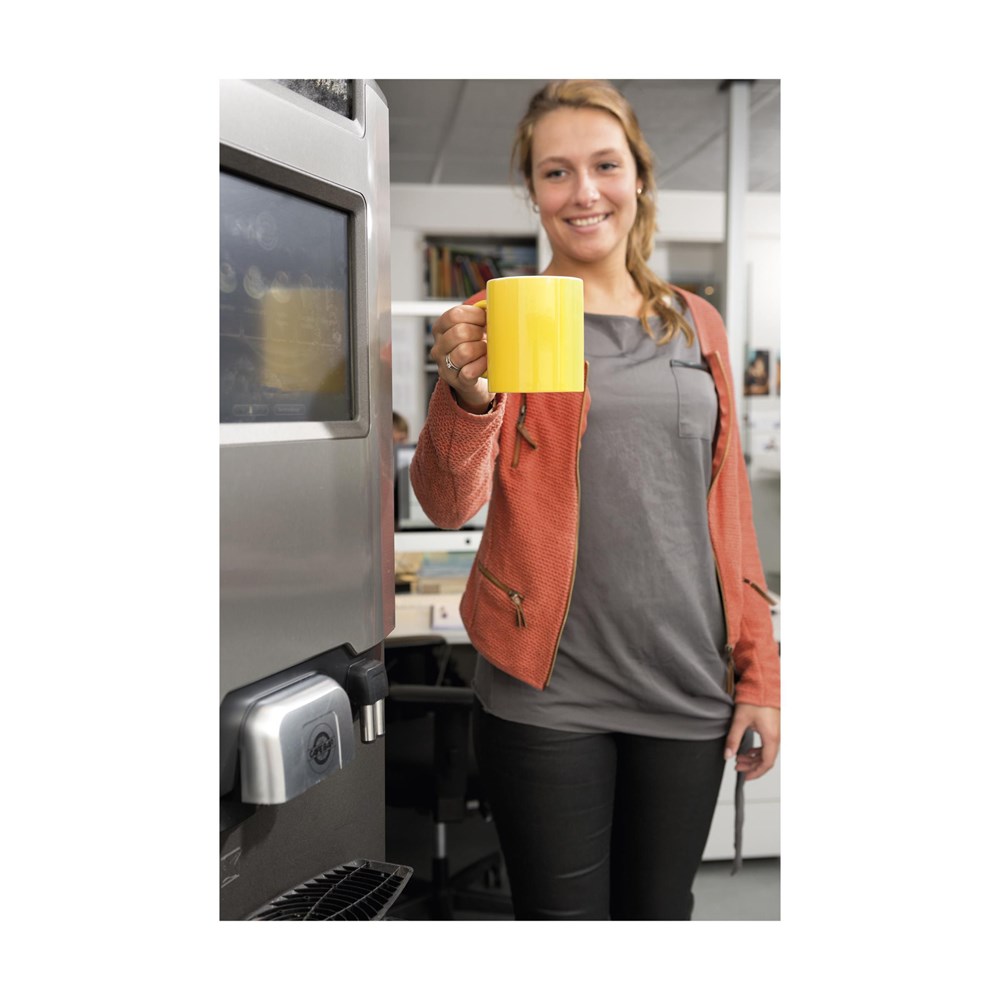 Mok van hoogwaardig keramiek. In geheel wit óf met gekleurde buitenzijde. Inhoud 350 ml. Vaatwasserbestendig. De opdruk is vaatwasmachine getest en gecertificeerd: EN 12875-2.