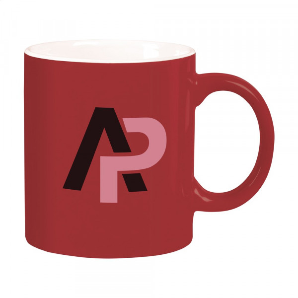 Mok van hoogwaardig keramiek. In geheel wit óf met gekleurde buitenzijde. Inhoud 350 ml. Vaatwasserbestendig. De opdruk is vaatwasmachine getest en gecertificeerd: EN 12875-2.