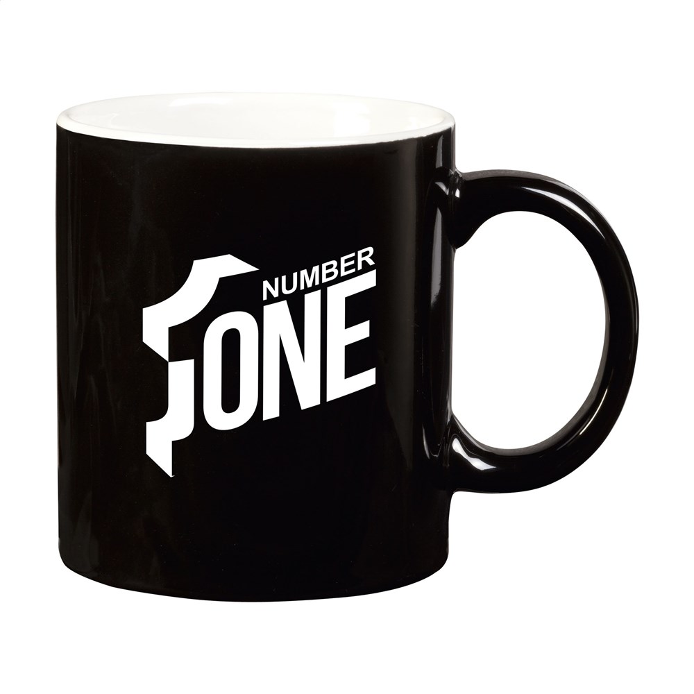 Mok van hoogwaardig keramiek. In geheel wit óf met gekleurde buitenzijde. Inhoud 350 ml. Vaatwasserbestendig. De opdruk is vaatwasmachine getest en gecertificeerd: EN 12875-2.