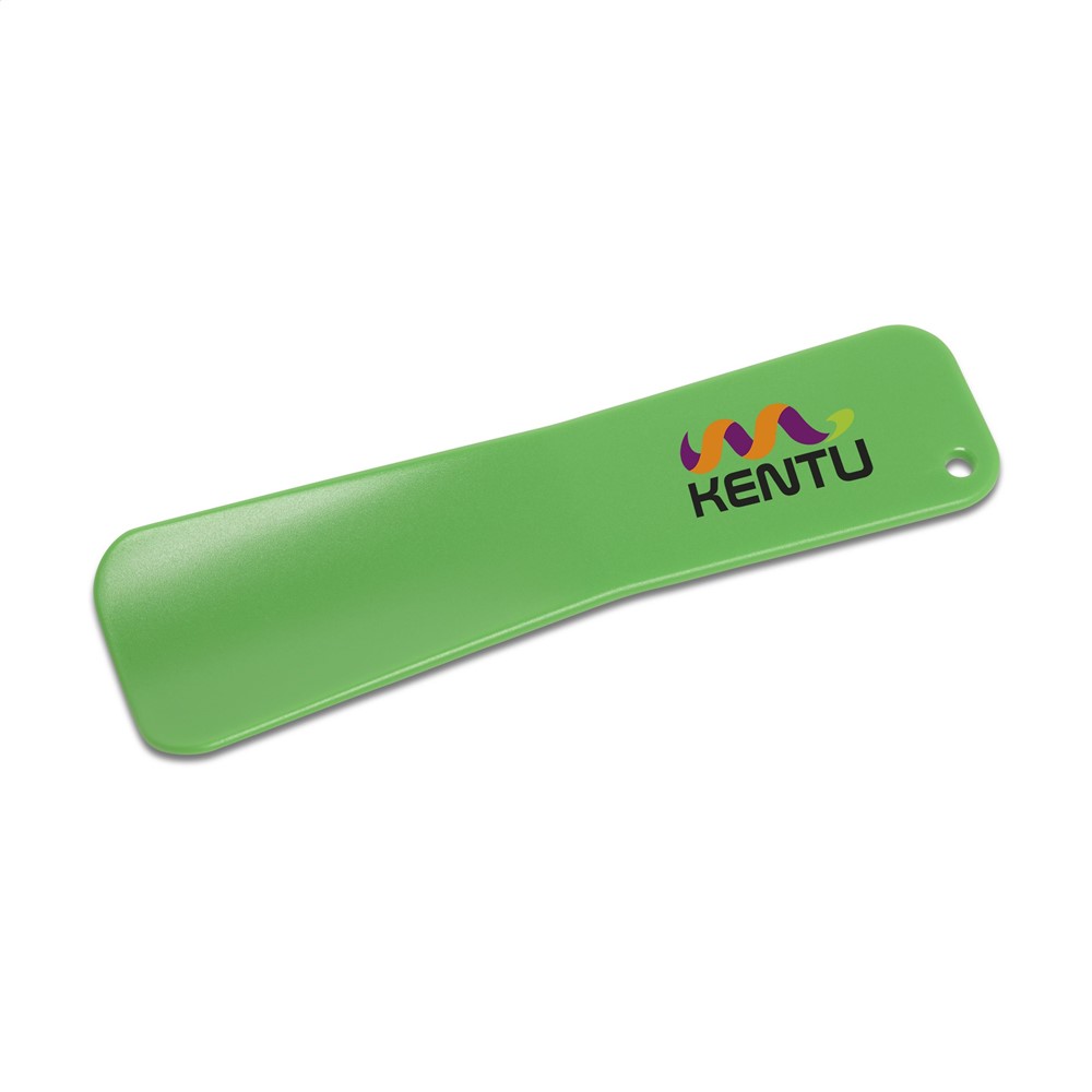 Stevige, kunststof schoenlepel als praktische reclamedrager. Een handige hulp bij het aantrekken van schoenen.