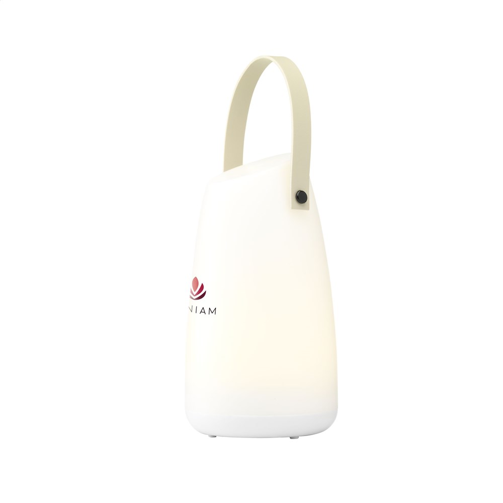 Snoerloze, kunststof tafellamp met LED-sfeerverlichting. In te stellen in 2 standen: helder wit licht of warm wit licht. Met handgreep. Gemakkelijk op te hangen of mee te nemen. Incl. batterijen en gebruiksaanwijzing. Per stuk in kraft doos.