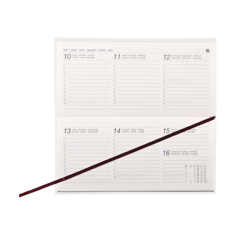 Zestalige zakagenda: NL, EN, F, D, I en ES. Imitatieleren, Balacron omslag met het jaartal op de voorzijde, 60 g. Wit schrijfpapier, tweekleurendruk, garengebonden, één week over twee pagina's, jaaroverzicht lopende jaar en eerste vier maanden volgende jaar, jaarkalender lopende jaar en volgende jaar, goud/zilver op snee. Omslag in zwart (3632.98) met goud op snee en jaartal in goud, andere kleuren omslagen met zilver op snee en jaartal in zilver. Gemaakt van papier met een FSC-Mix keurmerk.