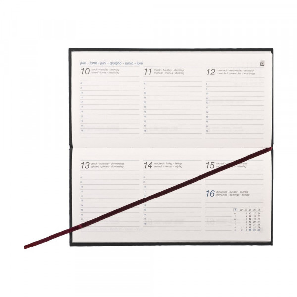 Zestalige zakagenda: NL, EN, F, D, I en ES. Imitatieleren, Balacron omslag met het jaartal op de voorzijde, 60 g. Wit schrijfpapier, tweekleurendruk, garengebonden, één week over twee pagina's, jaaroverzicht lopende jaar en eerste vier maanden volgende jaar, jaarkalender lopende jaar en volgende jaar, goud/zilver op snee. Omslag in zwart (3632.98) met goud op snee en jaartal in goud, andere kleuren omslagen met zilver op snee en jaartal in zilver. Gemaakt van papier met een FSC-Mix keurmerk.
