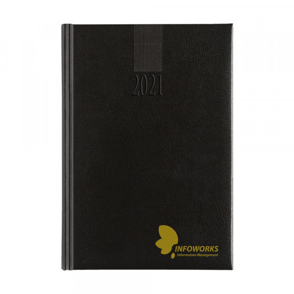 Viertalige bureau-agenda: NL, EN, F en D. Met sterk gewatteerde, imitatieleren Balacron omslag met het jaartal in blinddruk op de voorzijde, 80 g crème, houtvrij schrijfpapier, tweekleurendruk, garengebonden, royaal weekoverzicht over twee pagina's, jaarplanner lopende jaar en volgende jaar en extra pagina's met handige informatie. Extra groot formaat: 26,5 x 20 x 1,5 cm.