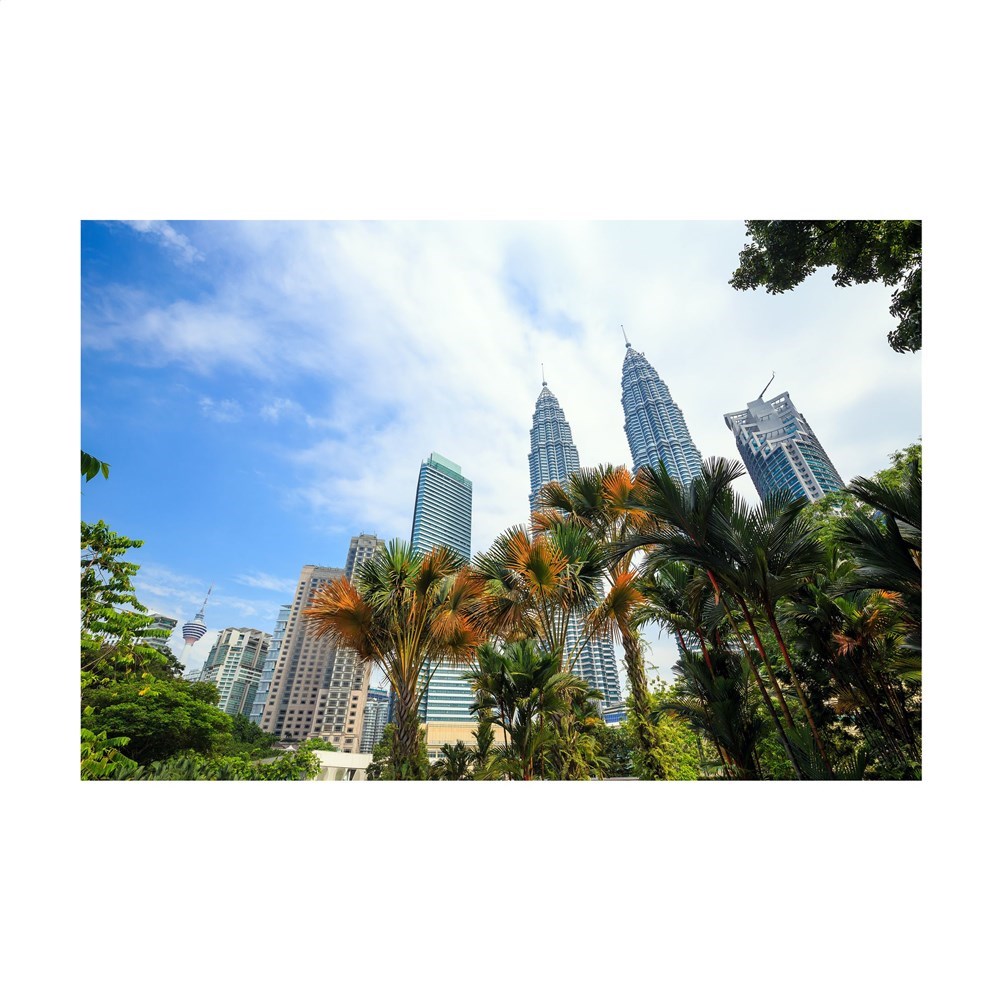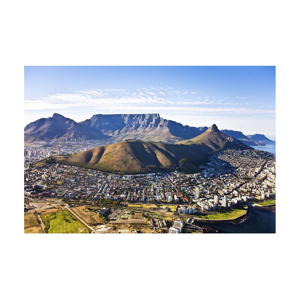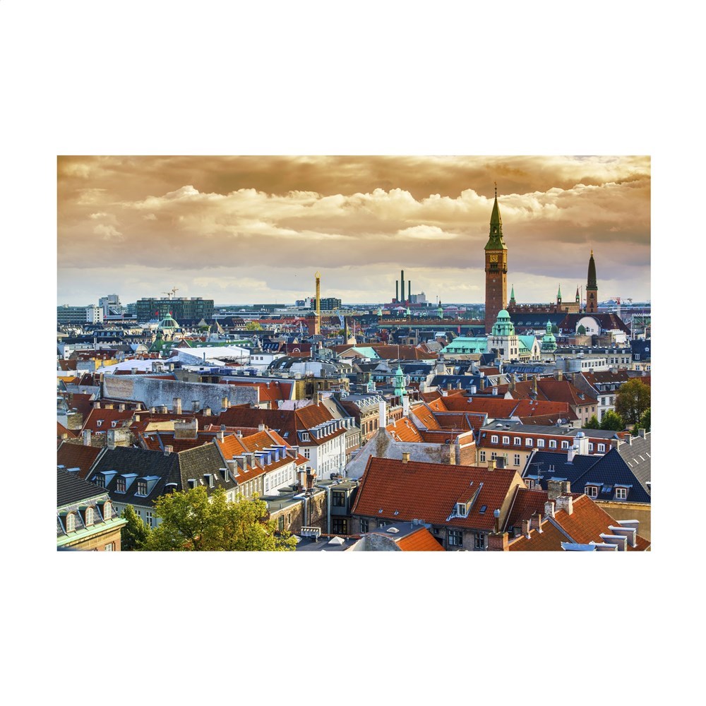 Viertalige bureaukalender: NL, EN, F en D met elke maand een foto van de skyline van een wereldstad, aan 2 zijden zichtbaar. Met metalen wire-o-binding en jaaroverzicht van het lopende en het volgende jaar. Gemaakt van papier met een FSC-Mix keurmerk.