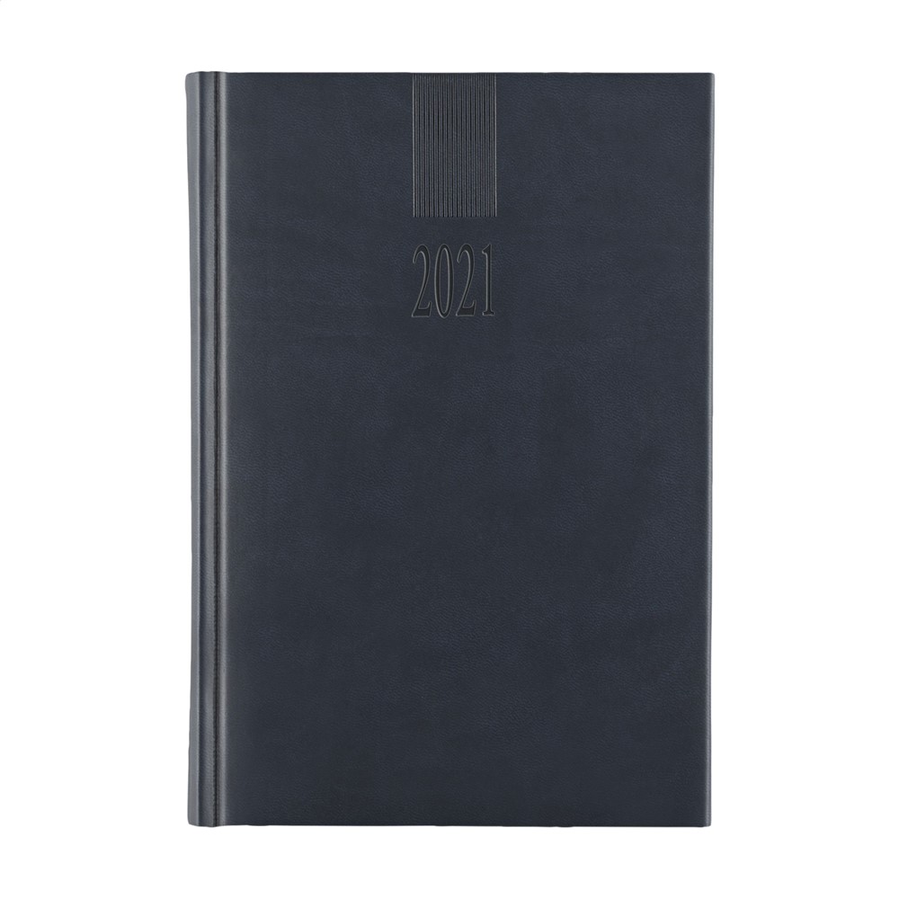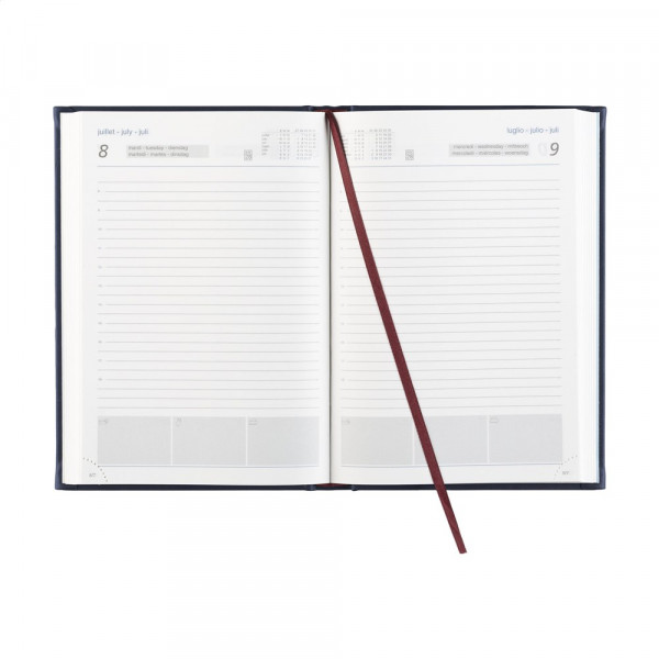 Zestalige bureau-agenda: NL, EN, F, D, I en ES. Met licht gewatteerde Sabana omslag en het jaartal in blinddruk op de voorzijde. 70 g. wit schrijfpapier, tweekleurendruk, garengebonden, hoekperforatie, één dag per pagina, jaarplanner lopende jaar en 2 kwartalen volgende jaar, extra pagina's met handige informatie. Gemaakt van papier met een FSC-Mix keurmerk.