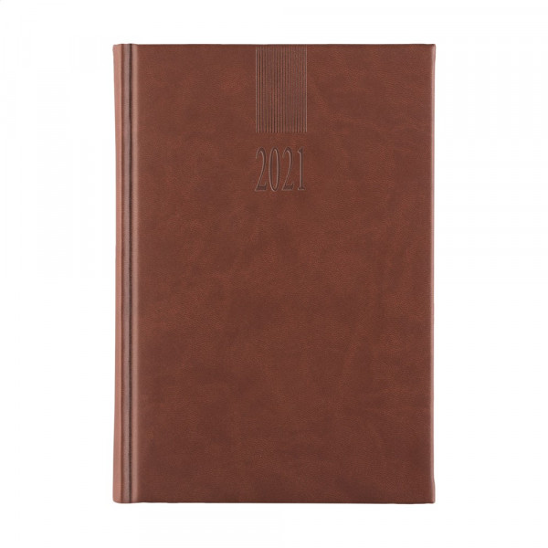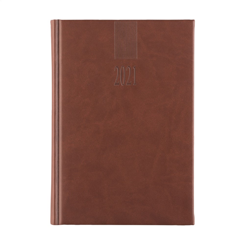 Zestalige bureau-agenda: NL, EN, F, D, I en ES. Met licht gewatteerde Sabana omslag en het jaartal in blinddruk op de voorzijde. 70 g. wit schrijfpapier, tweekleurendruk, garengebonden, hoekperforatie, één dag per pagina, jaarplanner lopende jaar en 2 kwartalen volgende jaar, extra pagina's met handige informatie. Gemaakt van papier met een FSC-Mix keurmerk.