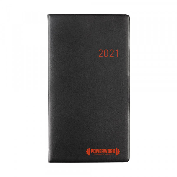 Viertalige zakagenda: NL, EN, F en D. Voorzien van een kunststof omslag. Tweekleurendruk, 70 g wit schrijfpapier, één week per pagina, adresregister en bladwijzer. Extra plat: 3 mm. Gemaakt van papier met een FSC-Mix keurmerk.