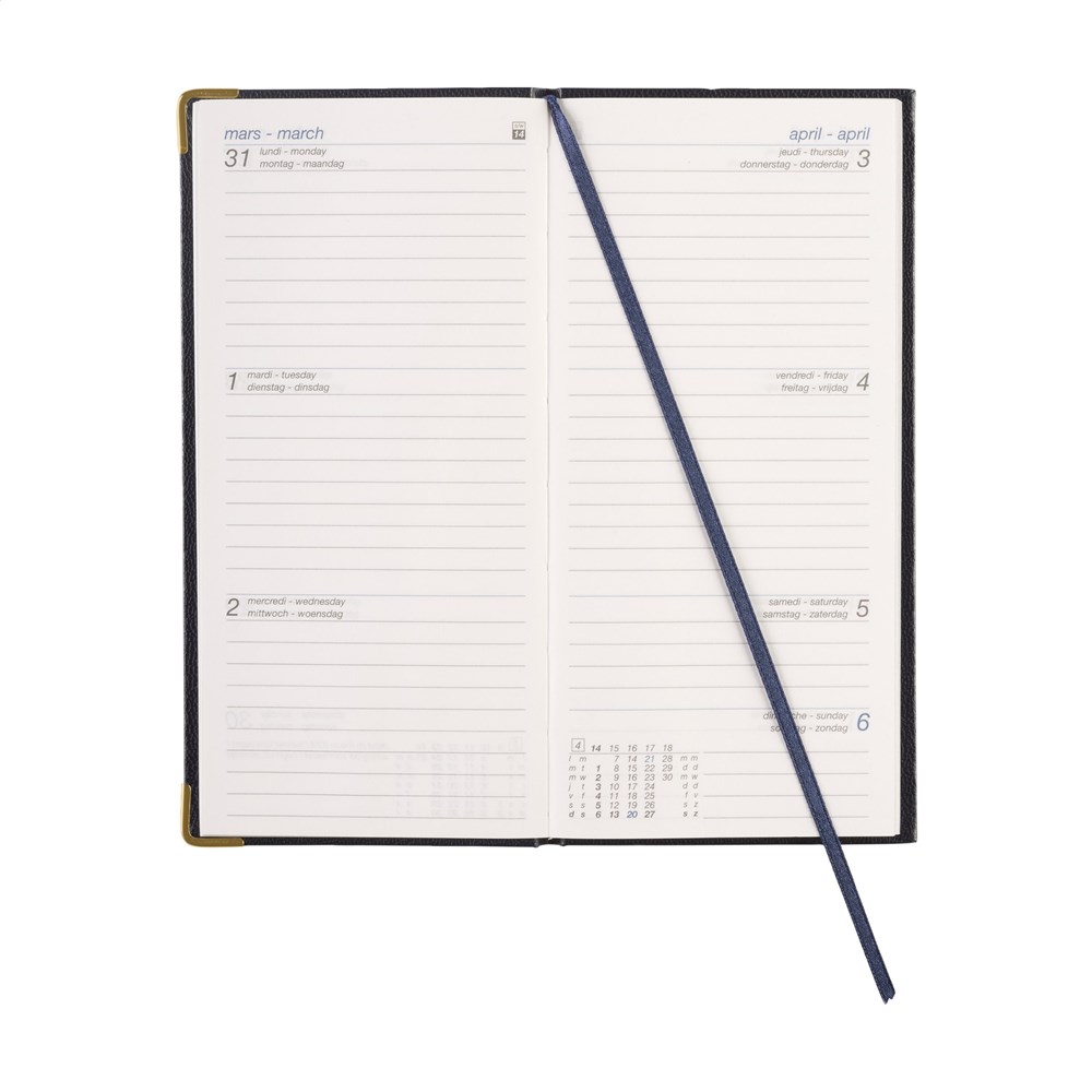 Viertalige zakagenda: NL, EN, F en D. Imitatieleren, Balacron omslag met het jaartal op de voorzijde, 60 g wit schrijfpapier, tweekleurendruk, garengebonden. Eén week over 2 pagina's, jaaroverzicht en jaarkalender van het lopende en volgende jaar. Omslag in blauw met zilver op snee, 2 verchroomde beschermhoekjes en zilverdruk op voorzijde. Omslag in zwart met goud op snee, 2 vergulde beschermhoekjes en gouddruk op voorzijde. Gemaakt van papier met een FSC-Mix keurmerk.