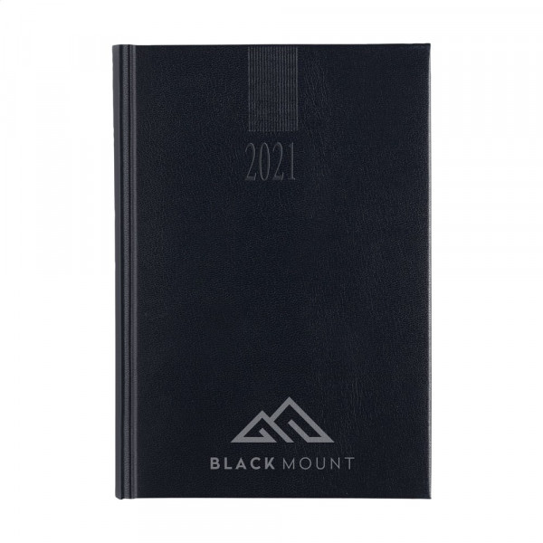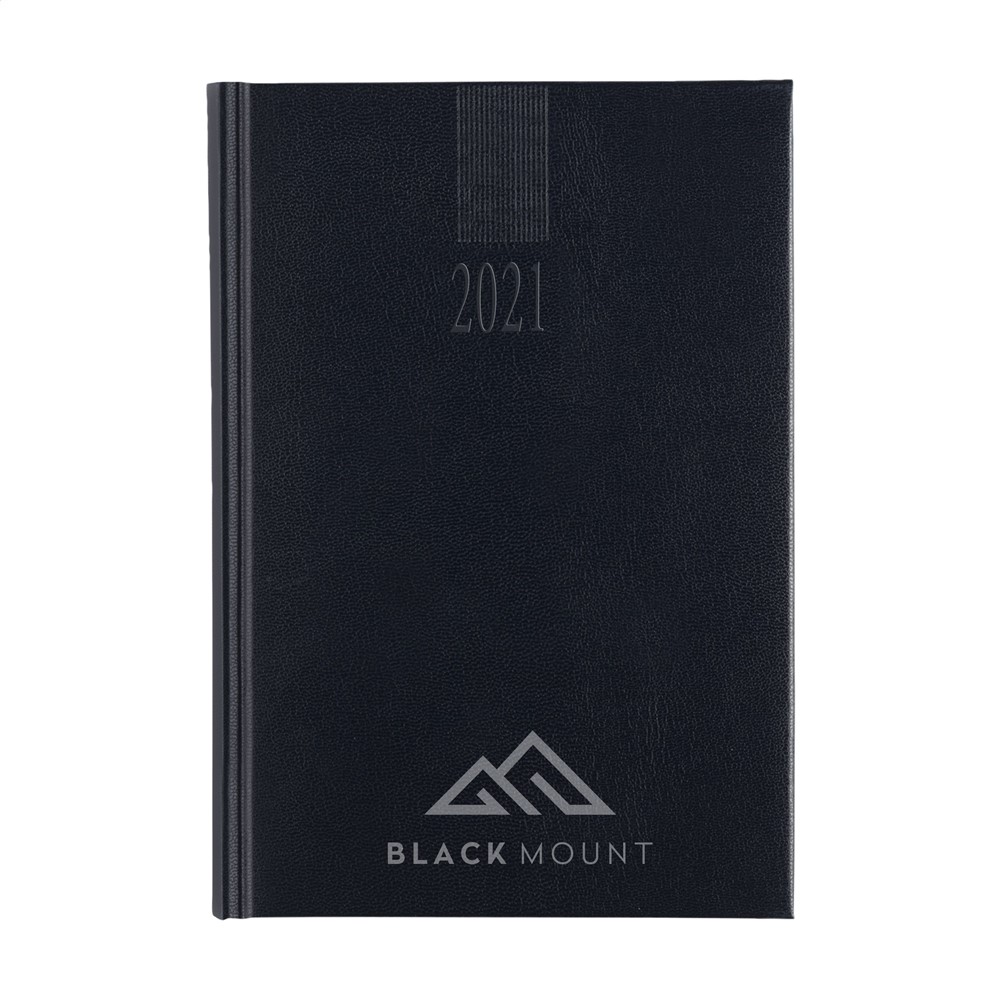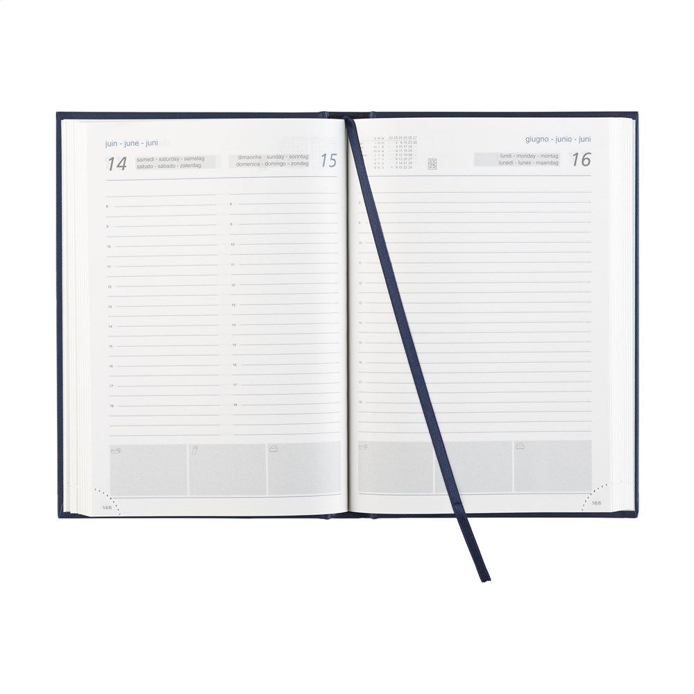 Zestalige bureau-agenda: NL, GB, F, D, I en ES. Met sterk gewatteerde, imitatieleren Balacron omslag en het jaartal in blinddruk op de voorzijde, 70 g. wit schrijfpapier, tweekleurendruk, garengebonden, hoekperforatie, één dag per pagina (zaterdag en zondag gecombineerd), jaarplanner lopende jaar en 2 kwartalen volgende jaar, notitieruimte voor elke dag, extra pagina's met handige informatie. Gemaakt van papier met een FSC-Mix keurmerk.