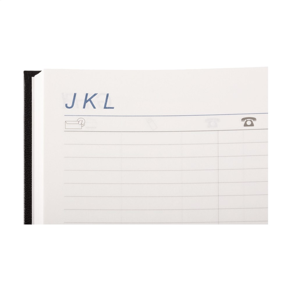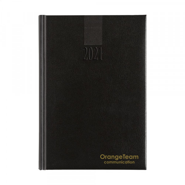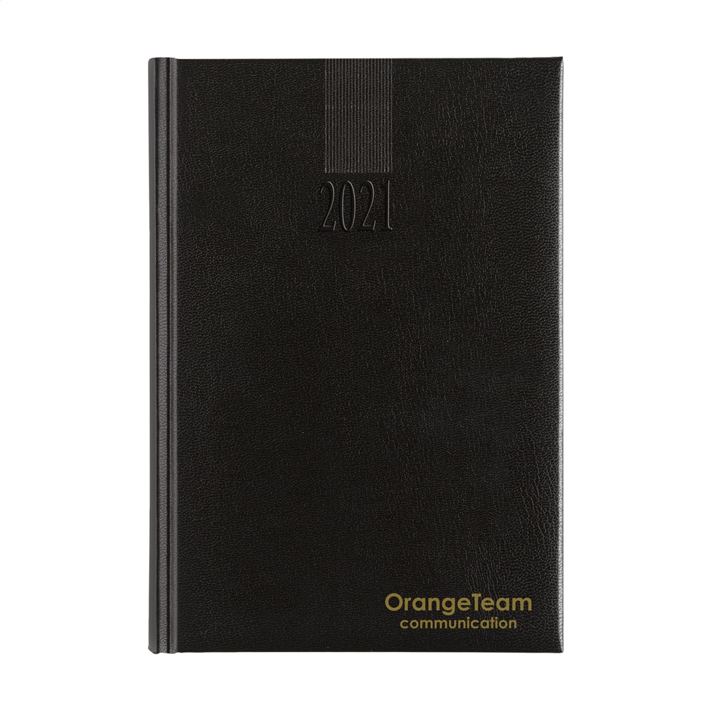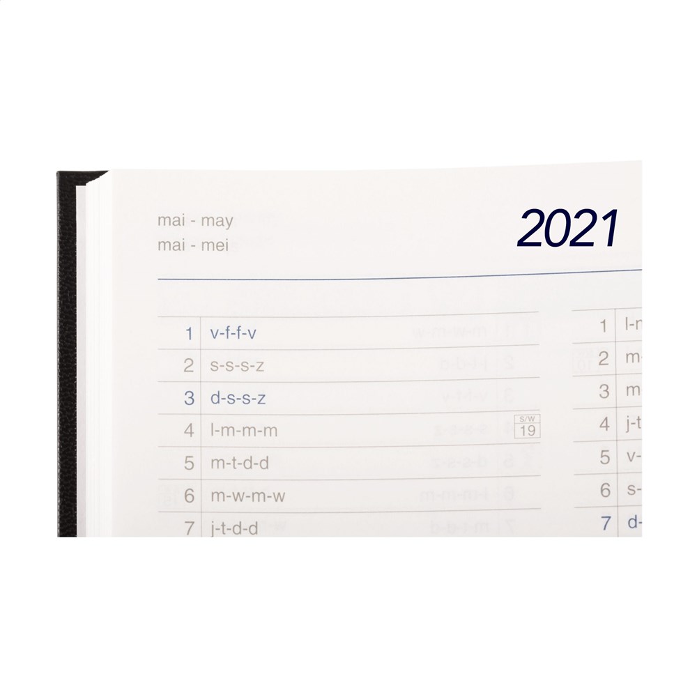 Viertalige bureau-agenda: NL, EN, F en D. Met sterk gewatteerde, imitatieleren Balacron omslag en het jaartal in blinddruk op de voorzijde, 80 g. wit schrijfpapier, tweekleurendruk, garengebonden, royaal weekoverzicht over twee pagina's, jaarplanner lopende jaar en volgende jaar, extra pagina's met handige informatie. Gemaakt van papier met een FSC-Mix keurmerk.