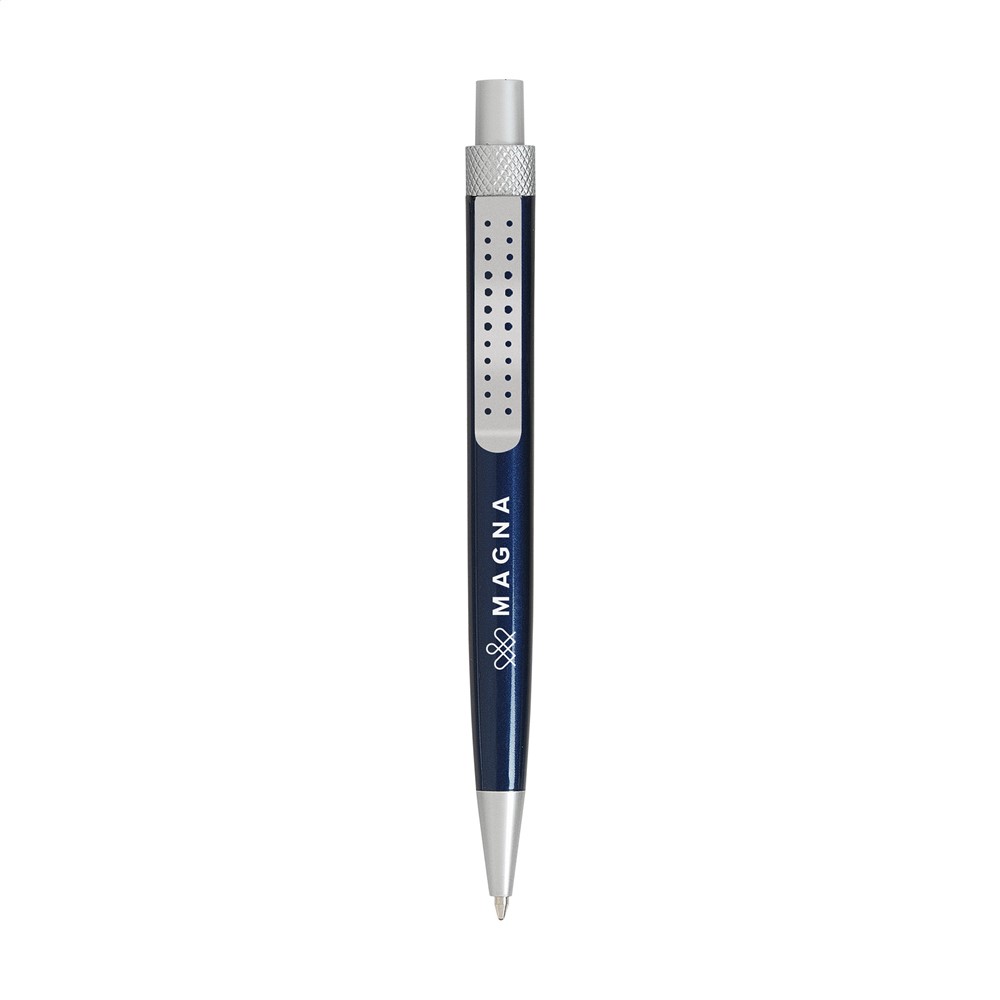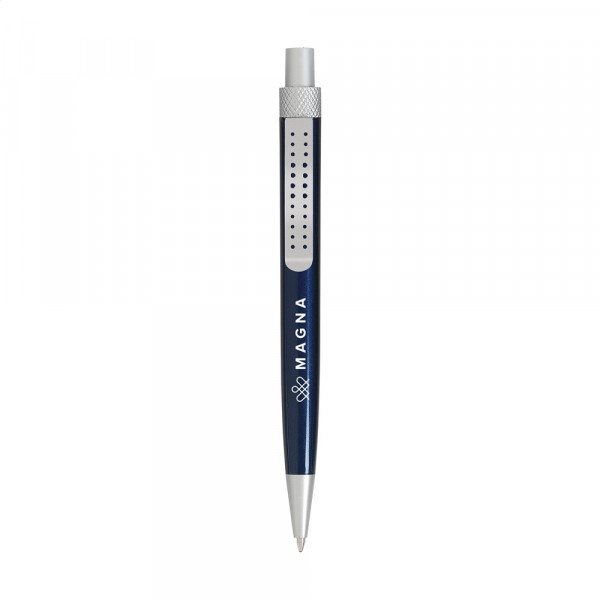 Blauwschrijvende balpen met houder in metallic look en metalen clip. mehr