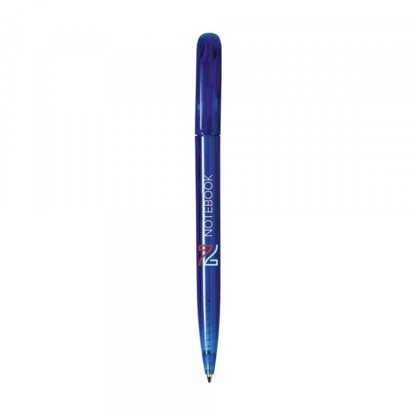 Blauwschrijvende óf zwartschrijvende balpen met transparantgekleurde houder, gebogen clip en draaikliksysteem.