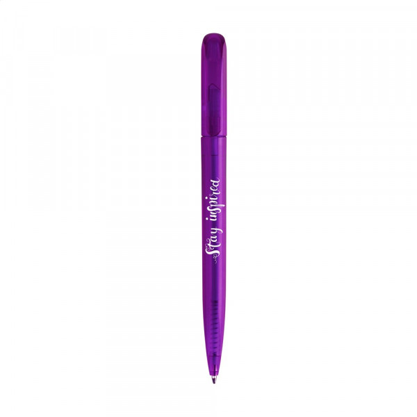 Blauwschrijvende óf zwartschrijvende balpen met transparantgekleurde houder, gebogen clip en draaikliksysteem.