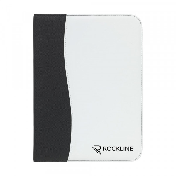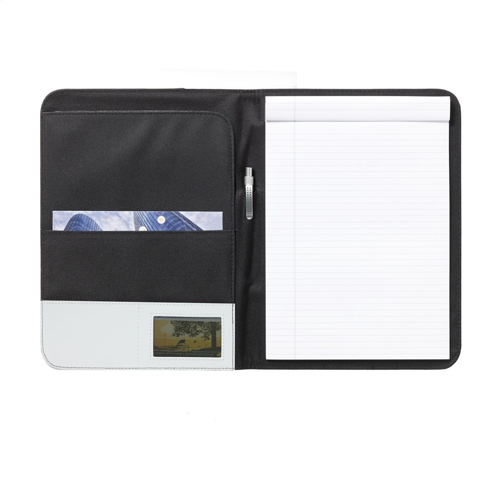 Schrijfmap/documentenmap van 600D nylon/imitatieleer in A4-formaat. Met diverse insteekvakken. Incl. schrijfblok en balpen.