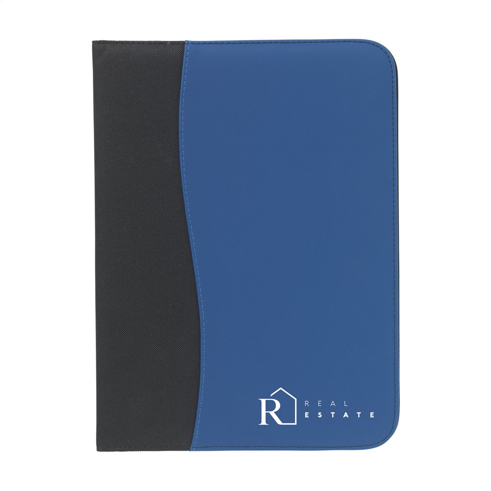Schrijfmap/documentenmap van 600D nylon/imitatieleer in A4-formaat. Met diverse insteekvakken. Incl. schrijfblok en balpen.