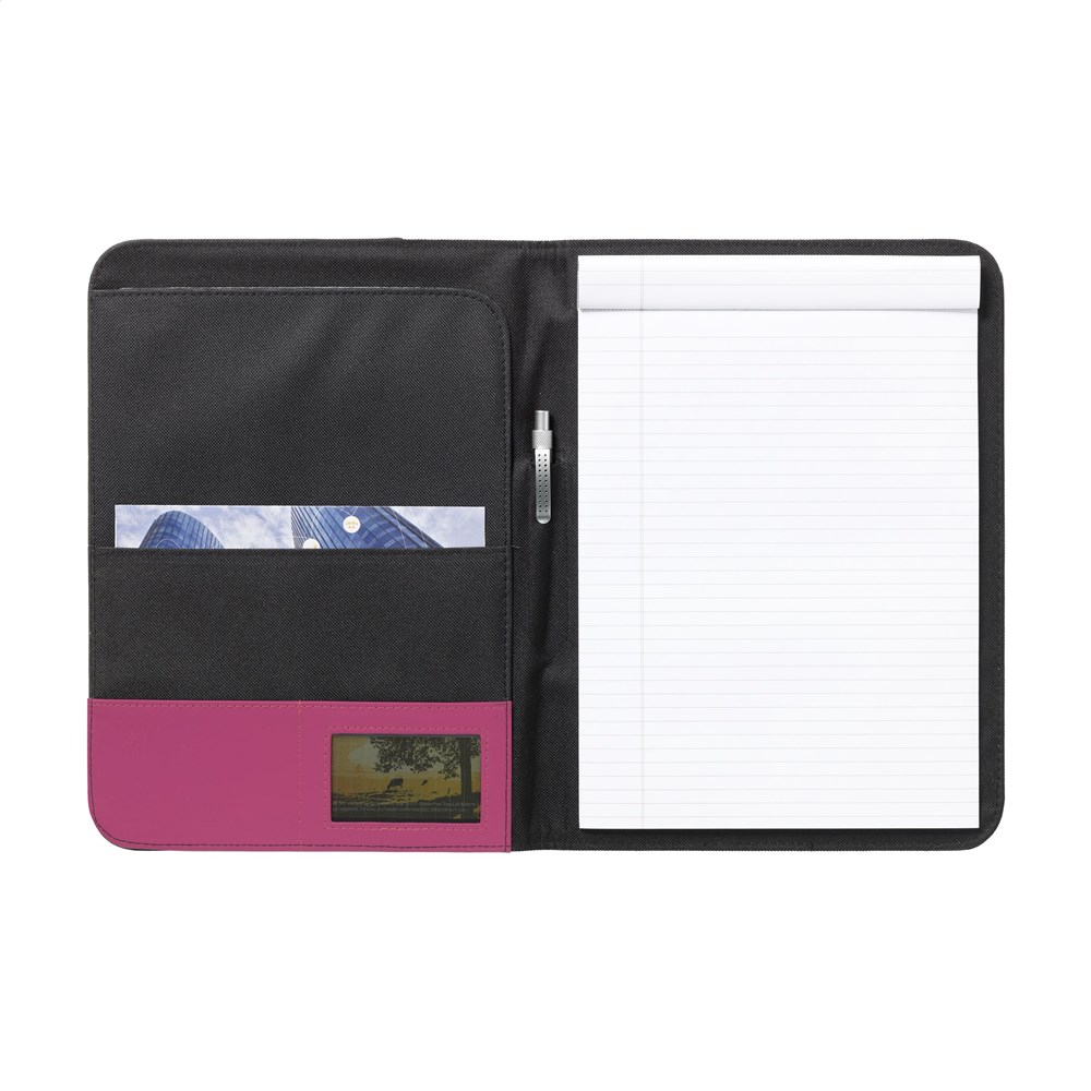 Schrijfmap/documentenmap van 600D nylon/imitatieleer in A4-formaat. Met diverse insteekvakken. Incl. schrijfblok en balpen.