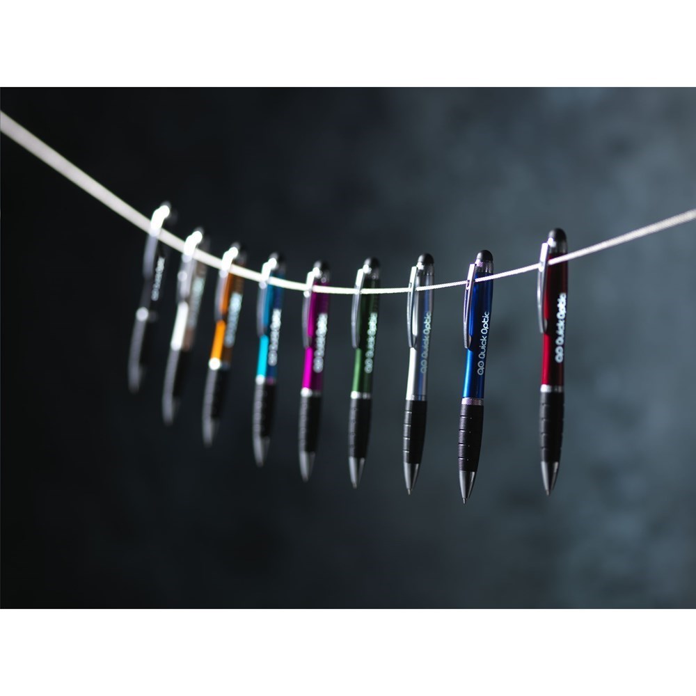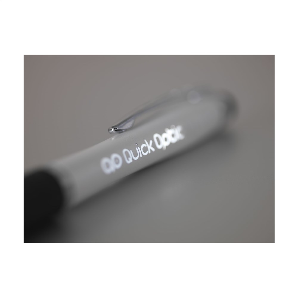 Blauwschrijvene balpen voorzien van een rubberen top/pointer. Perfect voor het bedienen van touchscreens (zoals iPhone/iPad). Met metallic look houder, zilverkleurige accenten, fraaie, metalen clip, gripvast, rubberen voorstuk en draaikliksysteem. Incl. batterijen.