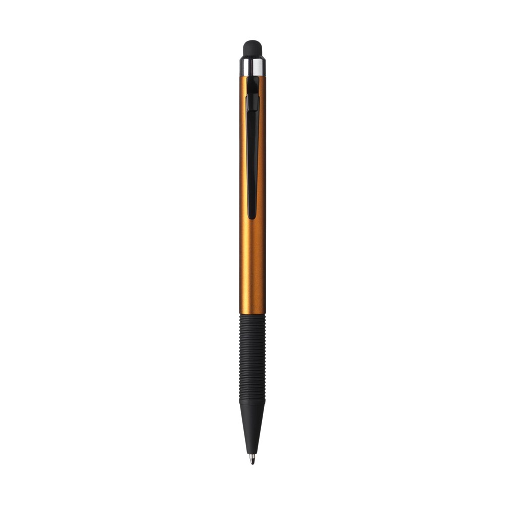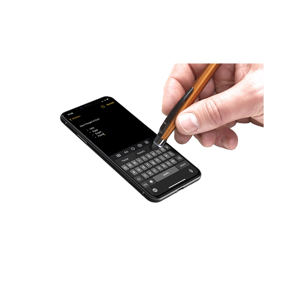 Blauwschrijvende, lichtgewicht balpen met top/pointer voor het bedienen van touchscreens (zoals Iphone/Ipad). Slanke houder in metallic look met clip, tevens aan-/uitknop en gripvast, rubberen voorstuk.