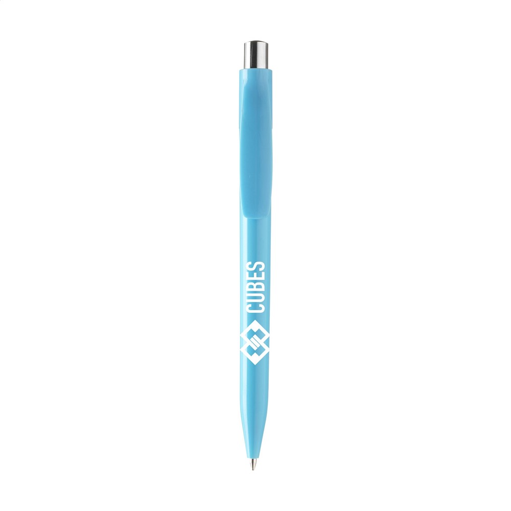 Blauwschrijvende balpen. Met matchend kleuraccent in de zilverkleurige drukknop.