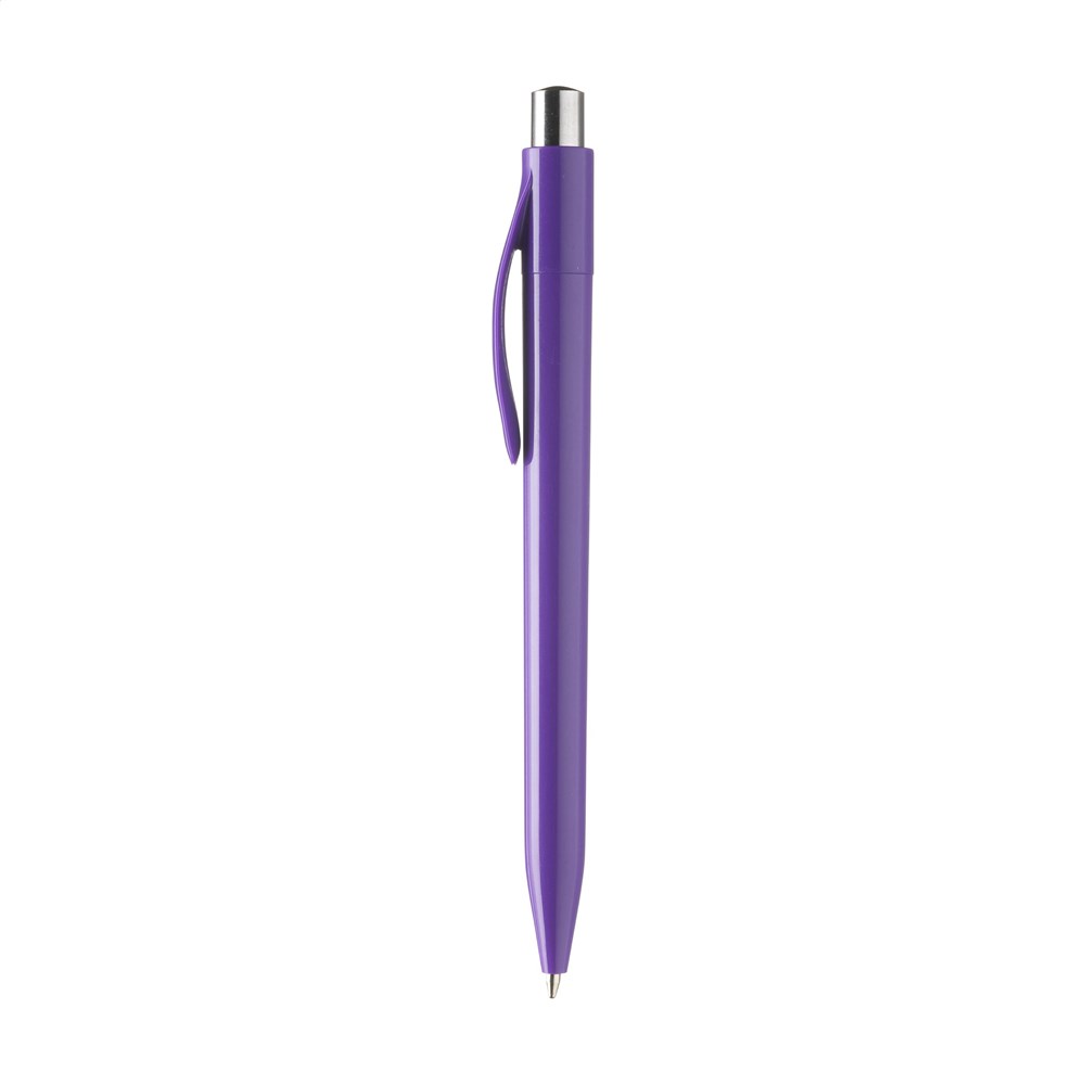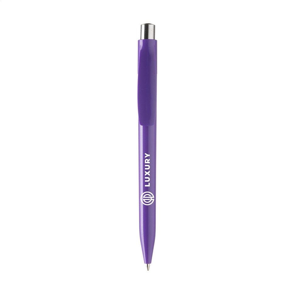 Blauwschrijvende balpen. Met matchend kleuraccent in de zilverkleurige drukknop.