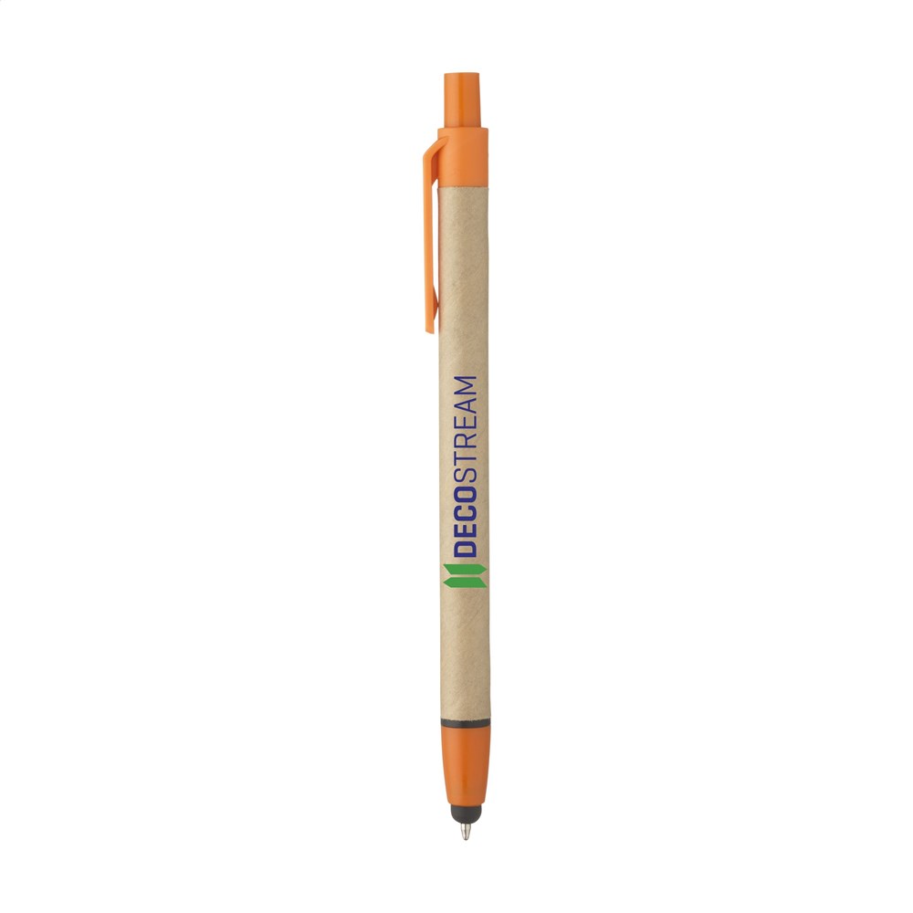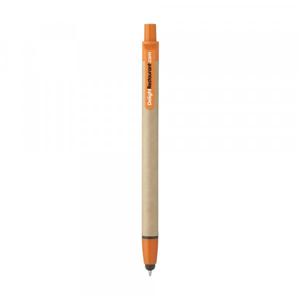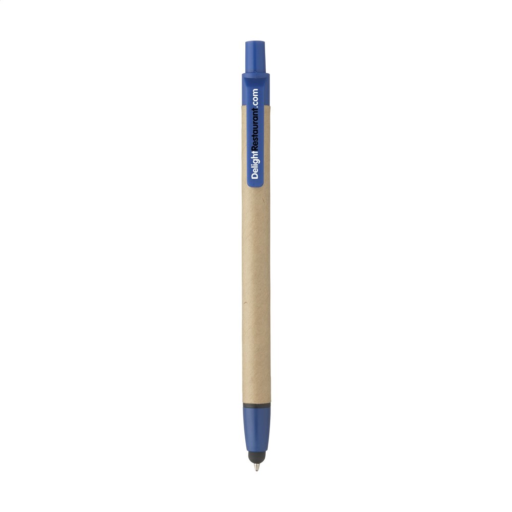 Blauwschrijvende balpen met houder van gerecycled karton, rubberen pointer voor het bedienen van touchscreens en kunststof accenten.