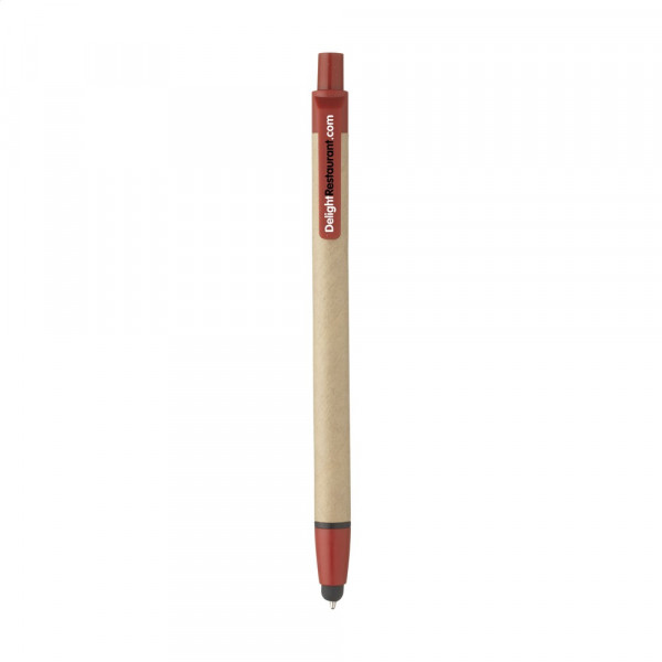 Blauwschrijvende balpen met houder van gerecycled karton, rubberen pointer voor het bedienen van touchscreens en kunststof accenten.