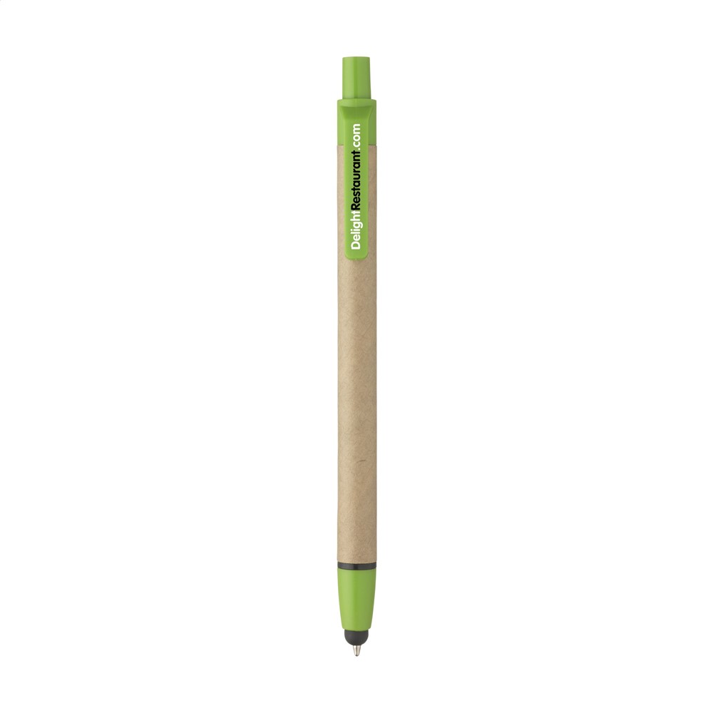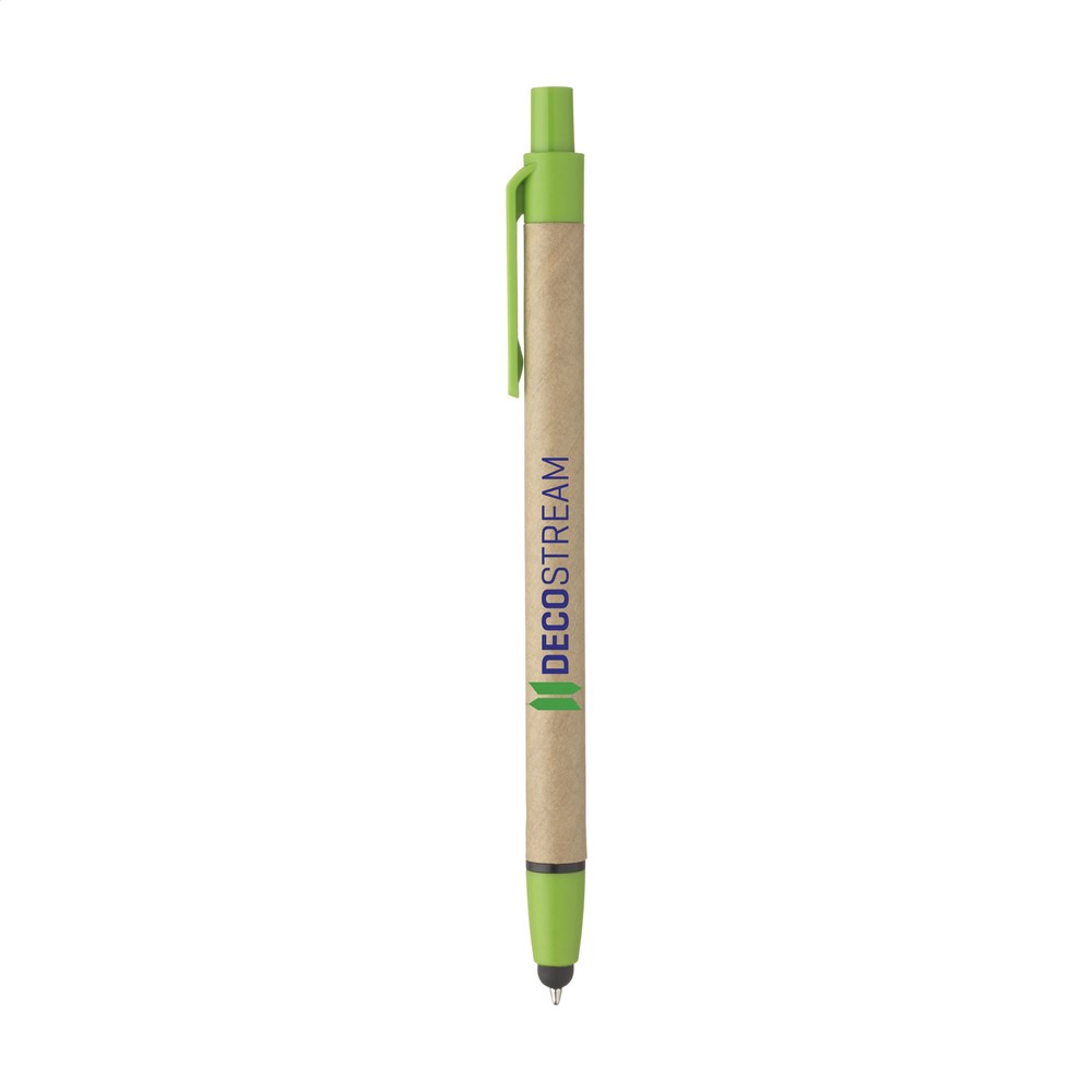 Blauwschrijvende balpen met houder van gerecycled karton, rubberen pointer voor het bedienen van touchscreens en kunststof accenten.