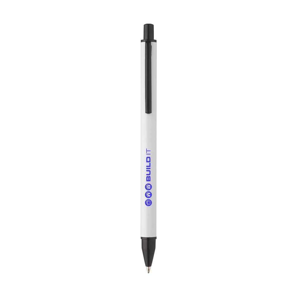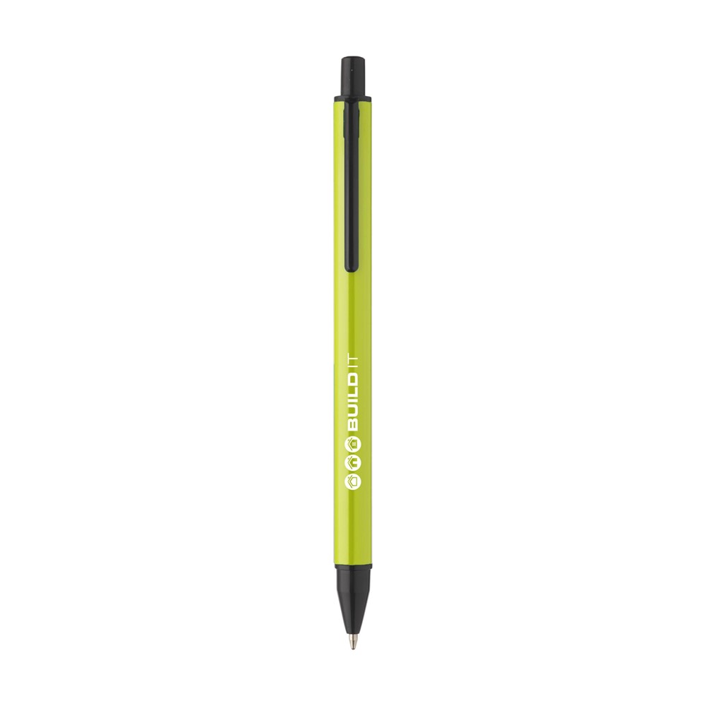 Blauwschrijvende, aluminium balpen met zwartaccenten, metalen klip en strakke vormgeving. mehr
