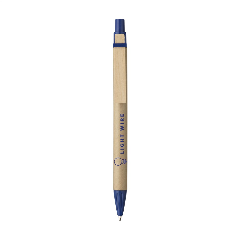 Blauwschrijvende balpen met houder van gerecycled karton, houten clip en gekleurde kunststof accenten.