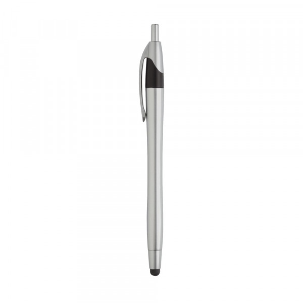 Blauwschrijvende, lichtgewicht, metallic look balpen met rubberen top/pointer voor het bedienen van touchscreens (zoals iPhone/iPad), drukknop en gestroomlijnde houder.