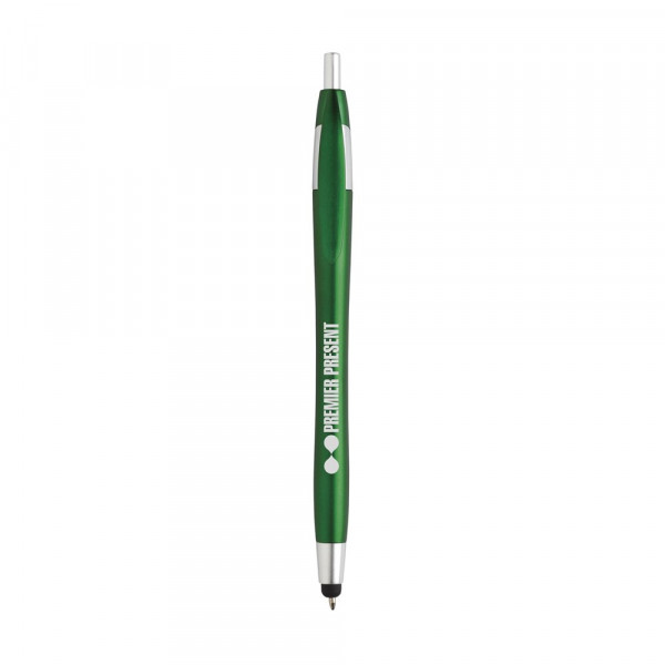 Blauwschrijvende, lichtgewicht, metallic look balpen met rubberen top/pointer voor het bedienen van touchscreens (zoals iPhone/iPad), drukknop en gestroomlijnde houder.