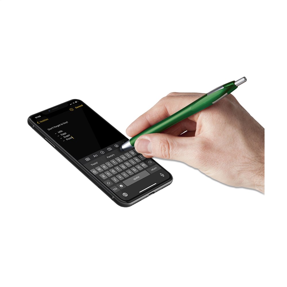 Blauwschrijvende, lichtgewicht, metallic look balpen met rubberen top/pointer voor het bedienen... mehr