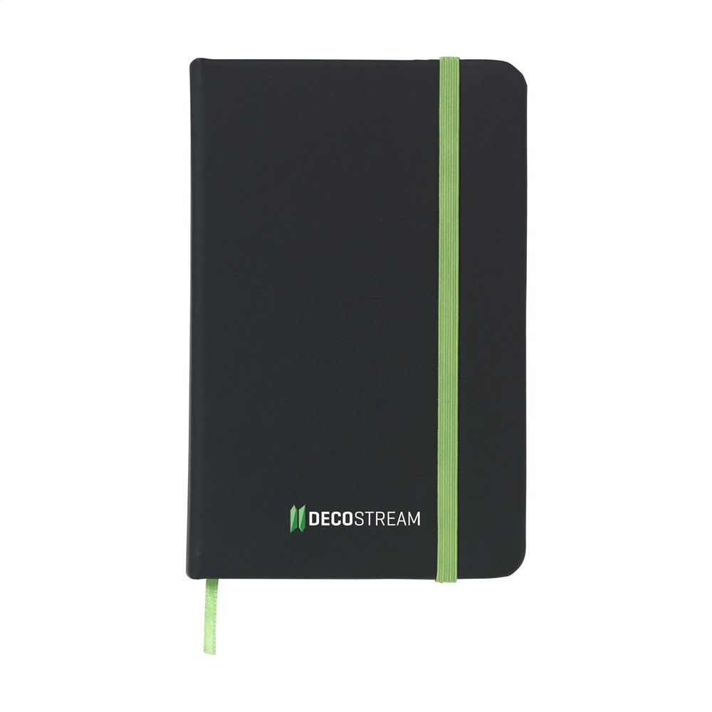 Praktisch en handzaam notitieboekje in A6 formaat. Met 80 vel crèmekleurig gelinieerd papier, stevige PU cover, elastische sluiting, gebonden rug en zijden leeslint.