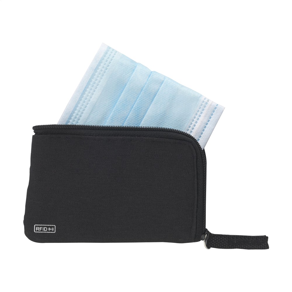 RFID sleutelbeurs van geweven polyester, nylon gevoerd. Met rits, RVS sleutelring en extra insteekvak voor pasjes. De RFID beschermingstechnologie beschermt de pasjes tegen skimmen en identiteitsdiefstal. Ook geschikt als opbergetui voor het veilig meenemen van een mondkapje.