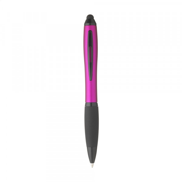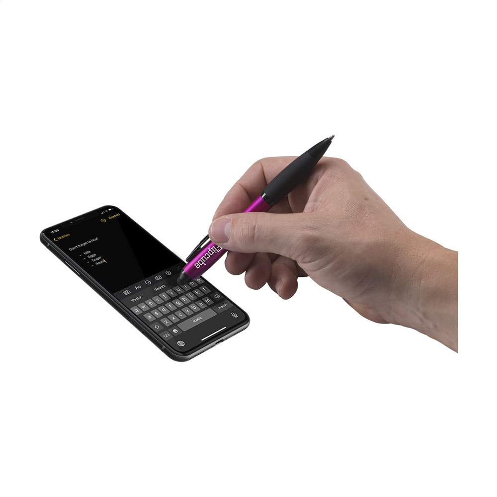 Blauwschrijvende balpen met houder in metallic look, gripvast, rubberen voorstuk, metalen clip en rubberen top/pointer voor het bedienen van touchscreens.